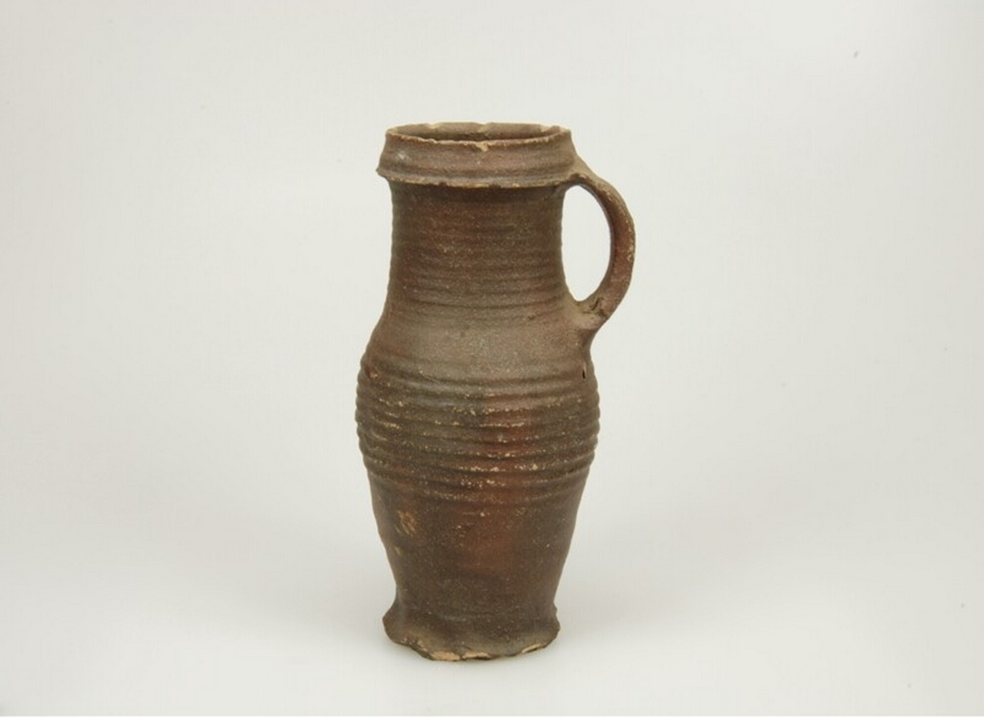 Kan; s5-kan-3; bolle kan met cilindrische hals en kraagrand; proto-steengoed; draairillen; standring; één verticaal lintoor; donkerbruin; productieplaats: Brunssum-Schinveld