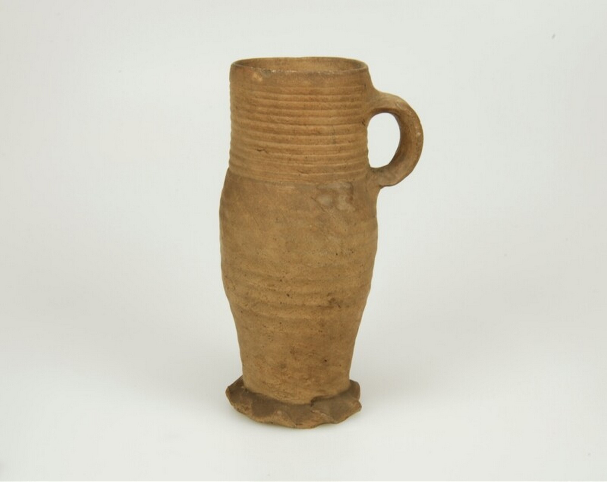 Kan; s1-kan-8; wijdmondige kan met licht gewelfde buik, vage knik op halsaanzet met rechte rand; steengoed; geknepen standring; één lintoor; draairingen; productieplaats: Siegburg