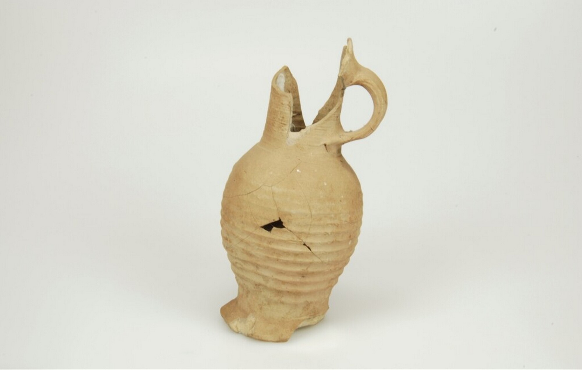 Kan; s1-kan-9; kan met afgeronde buikknik met hoge schouder en hoge cilindrische hals en rechte rand; steengoed; geknepen standring; één lintoor; draairillen; productieplaats: Siegburg
