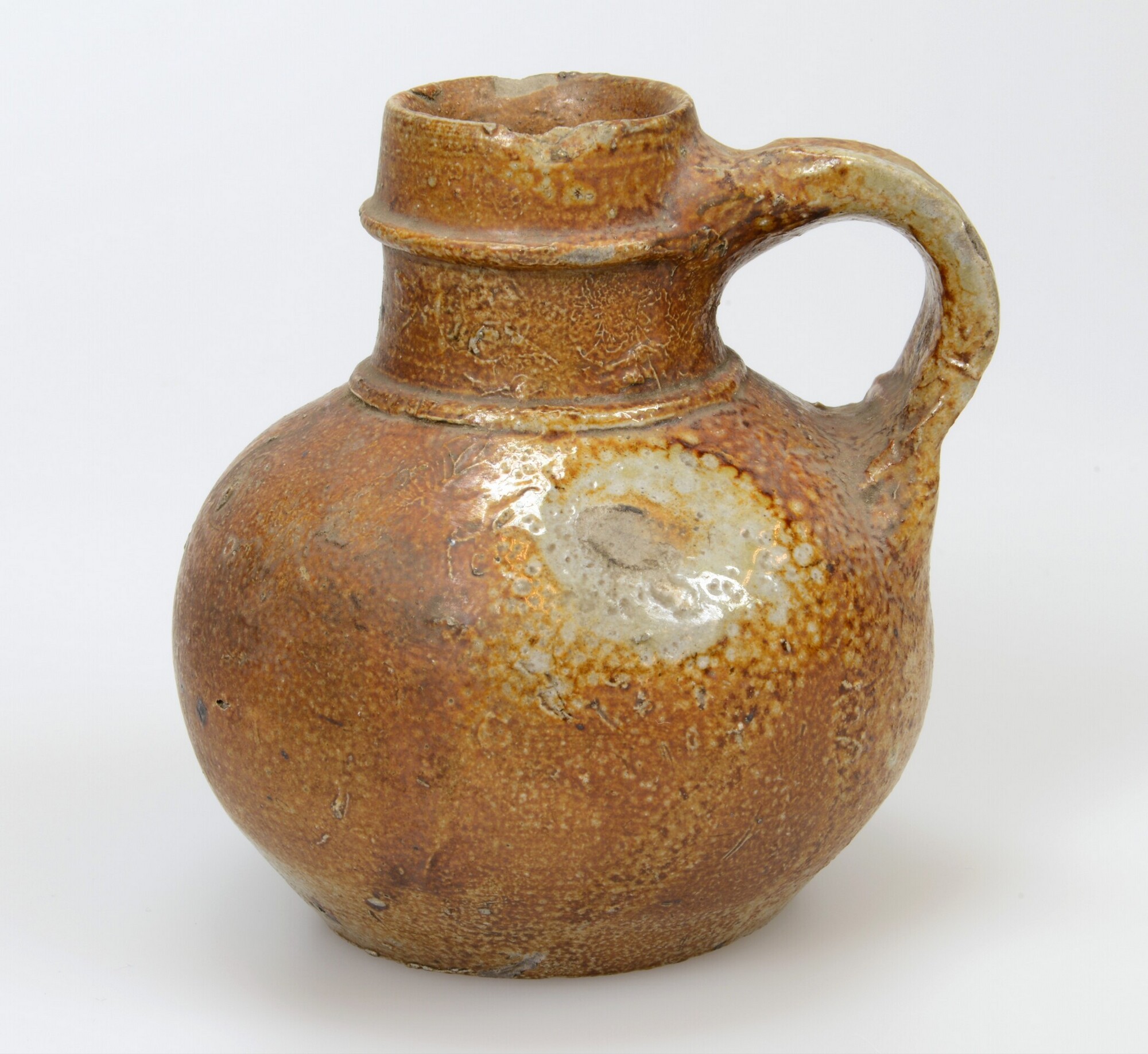 Kan; s2-kan-39; rondbuikige kan met cilindrische hals en hoge kraagrand en ribbel op halsaanzet, standvlak, verticaal lintoor; steengoed met oppervlaktebehandeling: ijzerengobe en zoutglazuur; tweedekeus product: resten van aangebakken voorwerp op wand; herkomst: Keulen of Frechen, Rijnland