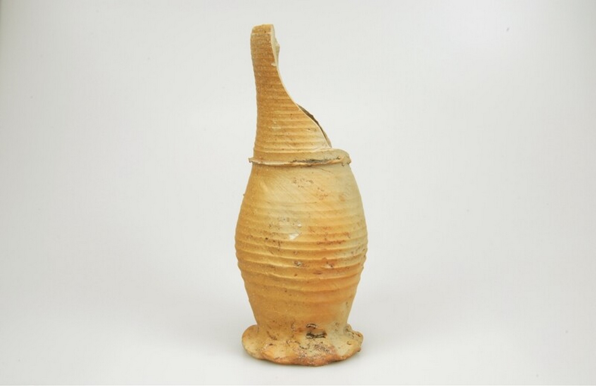 Kan; s1-kan-15; lage slanke bekervormige kan met kraag op halsaanzet en rechte rand; steengoed; oranje blos; geknepen standring; productieplaats: Siegburg