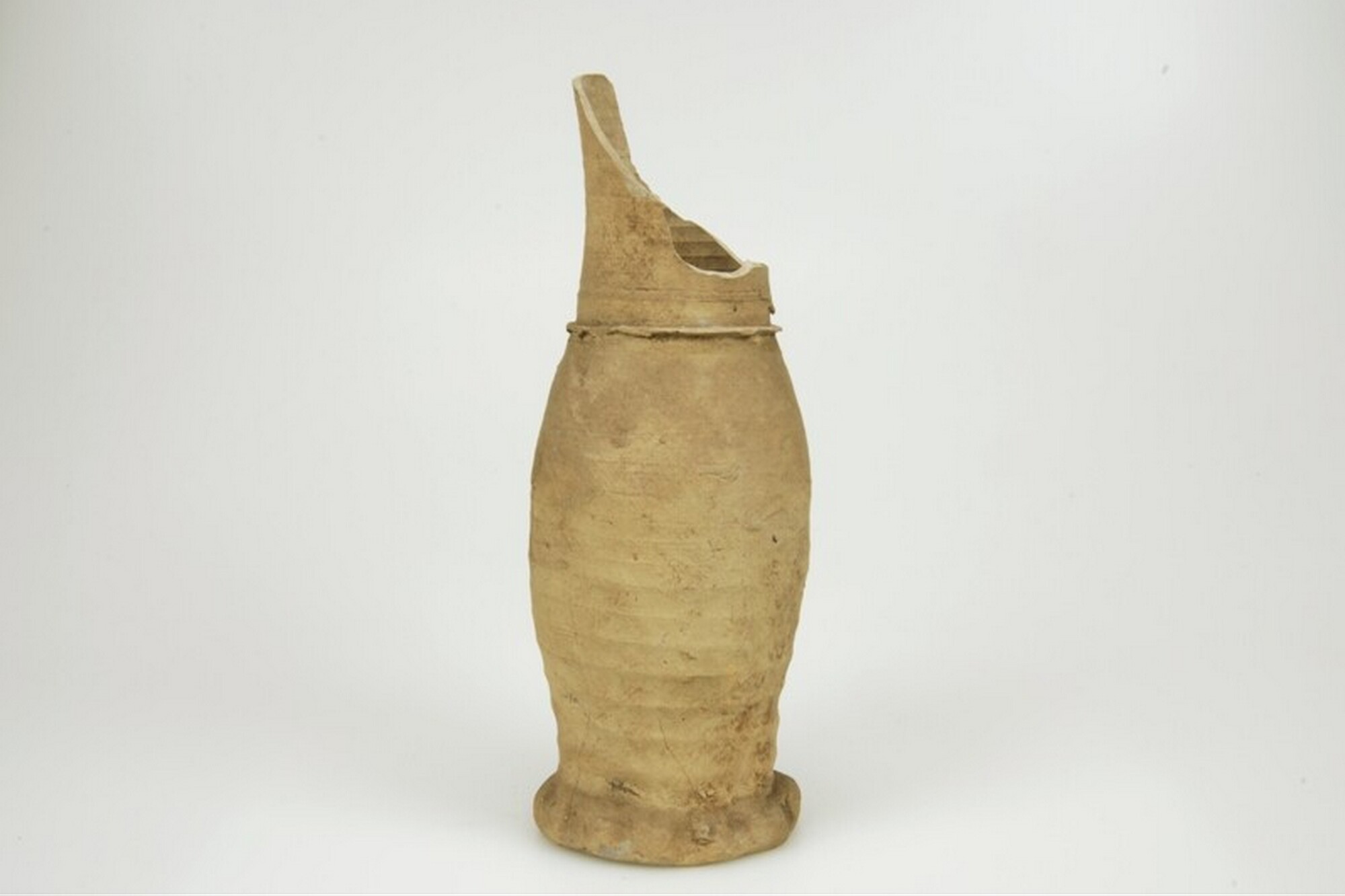 Kan; s1-kan-1; slanke hoge 'Jacobakan' met kraag op halsaanzet; steengoed; geknepen standring; één lintoor (ontbreekt); productieplaats: Siegburg; De Stuers, 19e eeuwse vondst