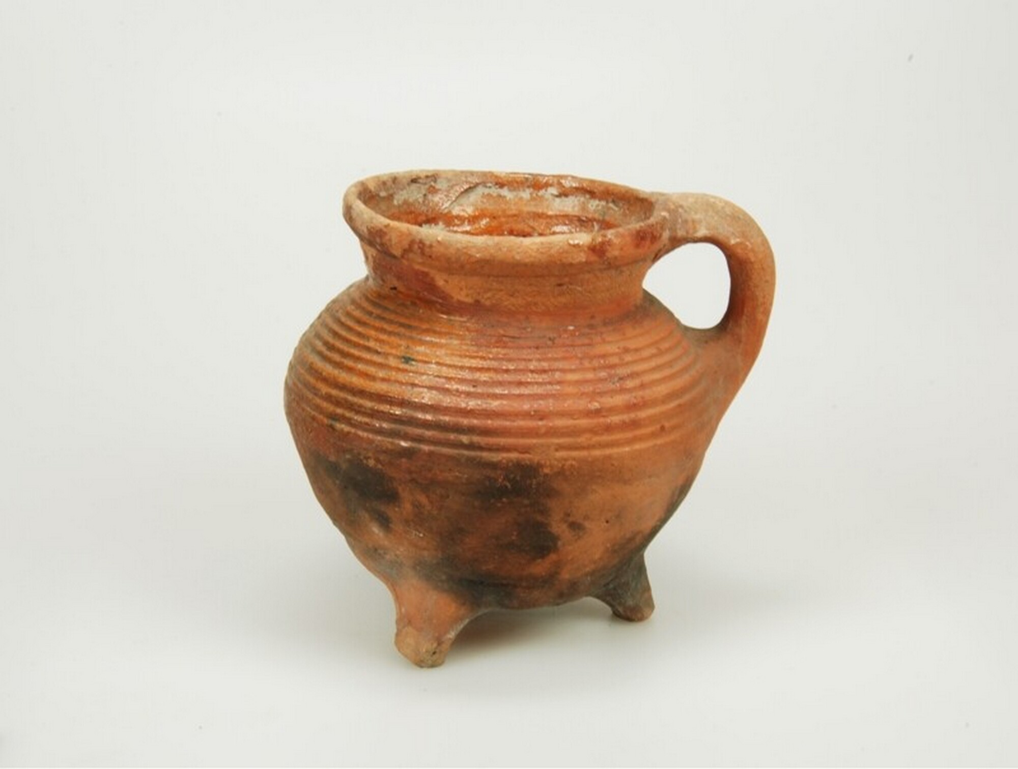 Grape; r-gra-55; bolle grape met hoge hals met verdikte lip, ribbels op halsaanzet; roodbakkend; in- en uitwendig spaarzaamloodglazuur; roetsporen; driepoot; één verticaal worstoor