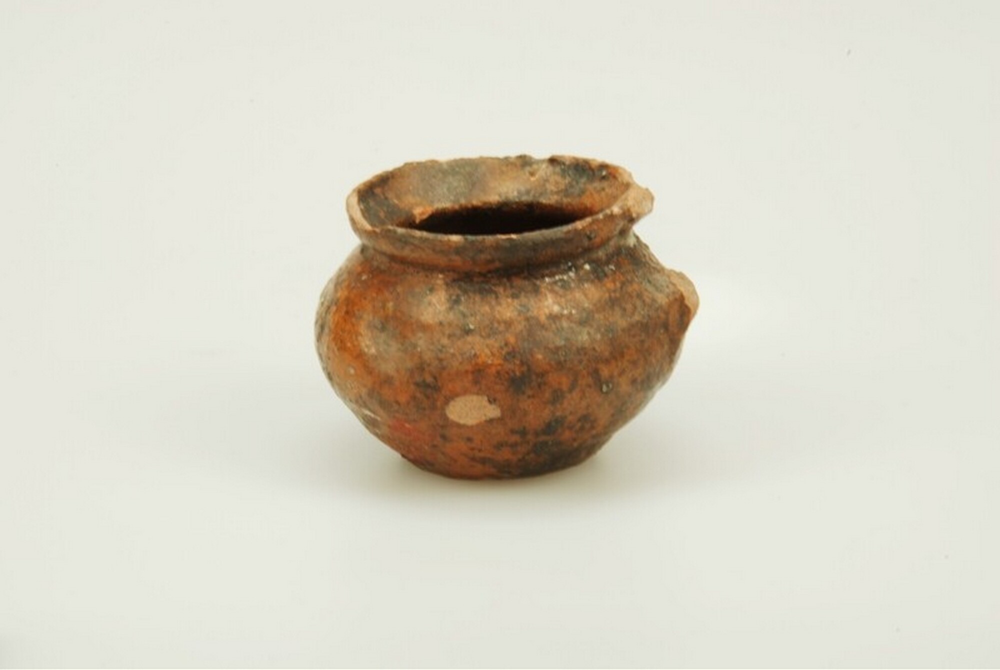 Miniatuur pispot; r-pis-7; biconische pispot met afgeronde buikknik, zonder hals met naar buiten geknikte rand, naar binnen gebogen lip en dekselgeul; roodbakkend; in- en uitwendig loodglazuur; ziel; één worstoor (ontbreekt)