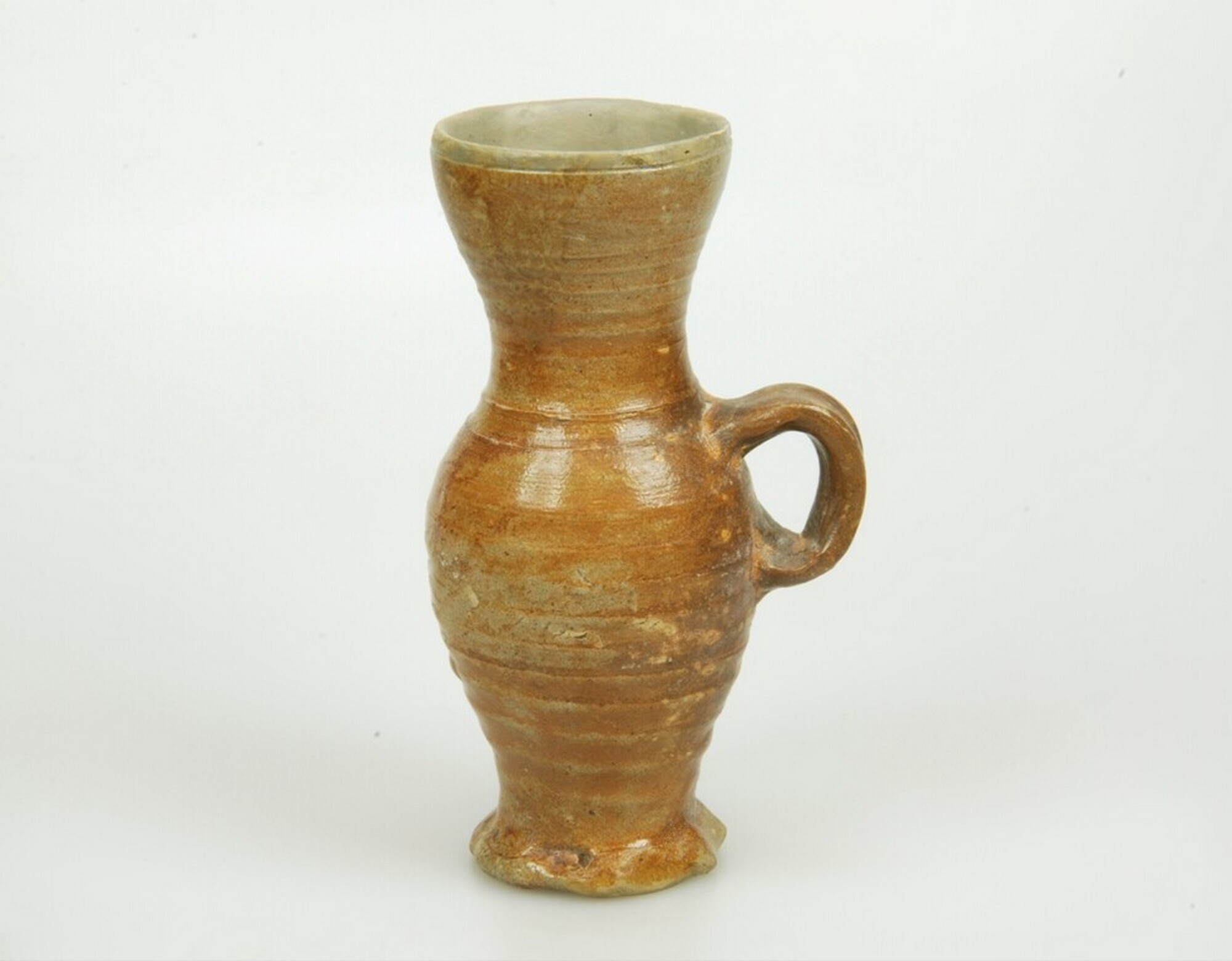 Trechterbeker; s2-tre-5; trechterbeker met groot lichaam en afgeronde trechter; steengoed met zoutglazuur en ijzerengobe; geknepen standring; één verticaal lintoor; productieplaats: Keulen/Raeren