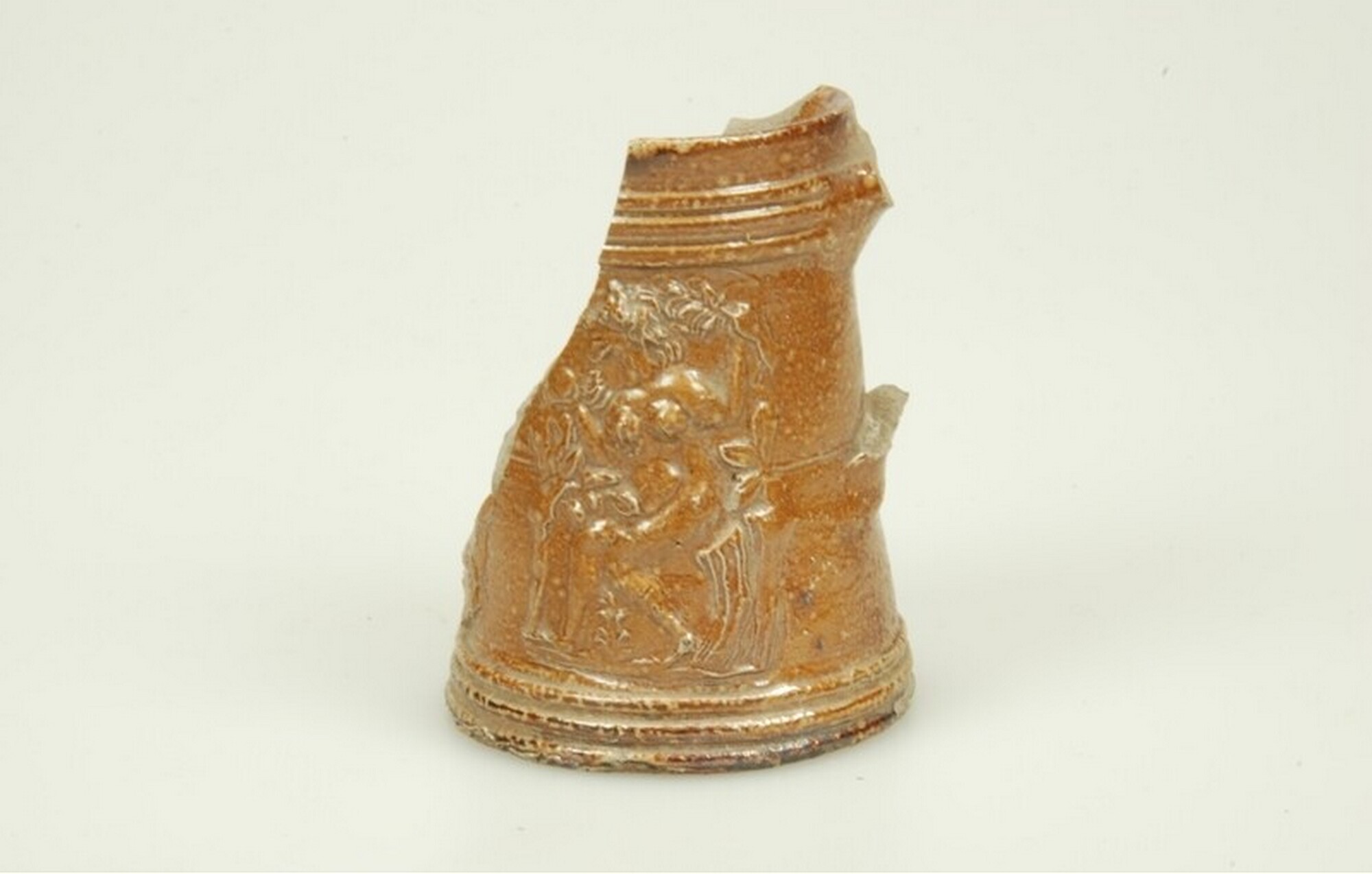 Beker; s2-bek-3; steengoed; zoutglazuur, ijzerengobe; standvoet; Adam&Eva applique; Keulen/Raeren; De Stuers (19e eeuwse vondst)