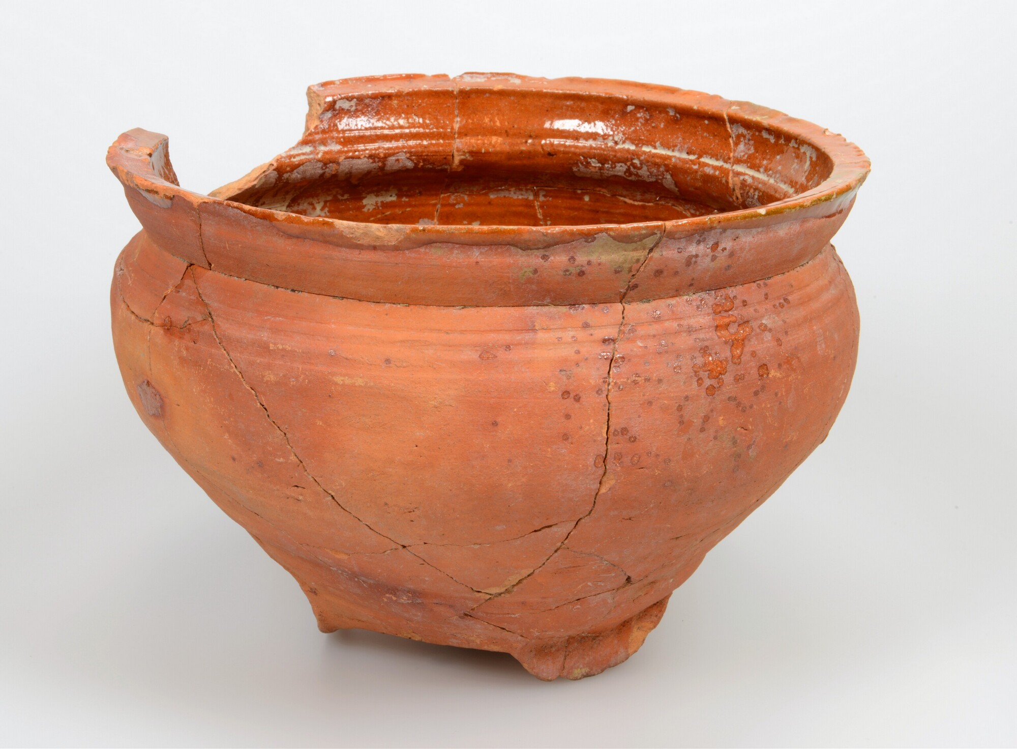 Kom; r-kom-5; bolle kom met ingesnoerde hals en vierkante rand; roodbakkend; inwendig en op de rand loodglazuur, uitwendig spatten loodglazuur; 3 standlobben; witte aanslag binnenzijde