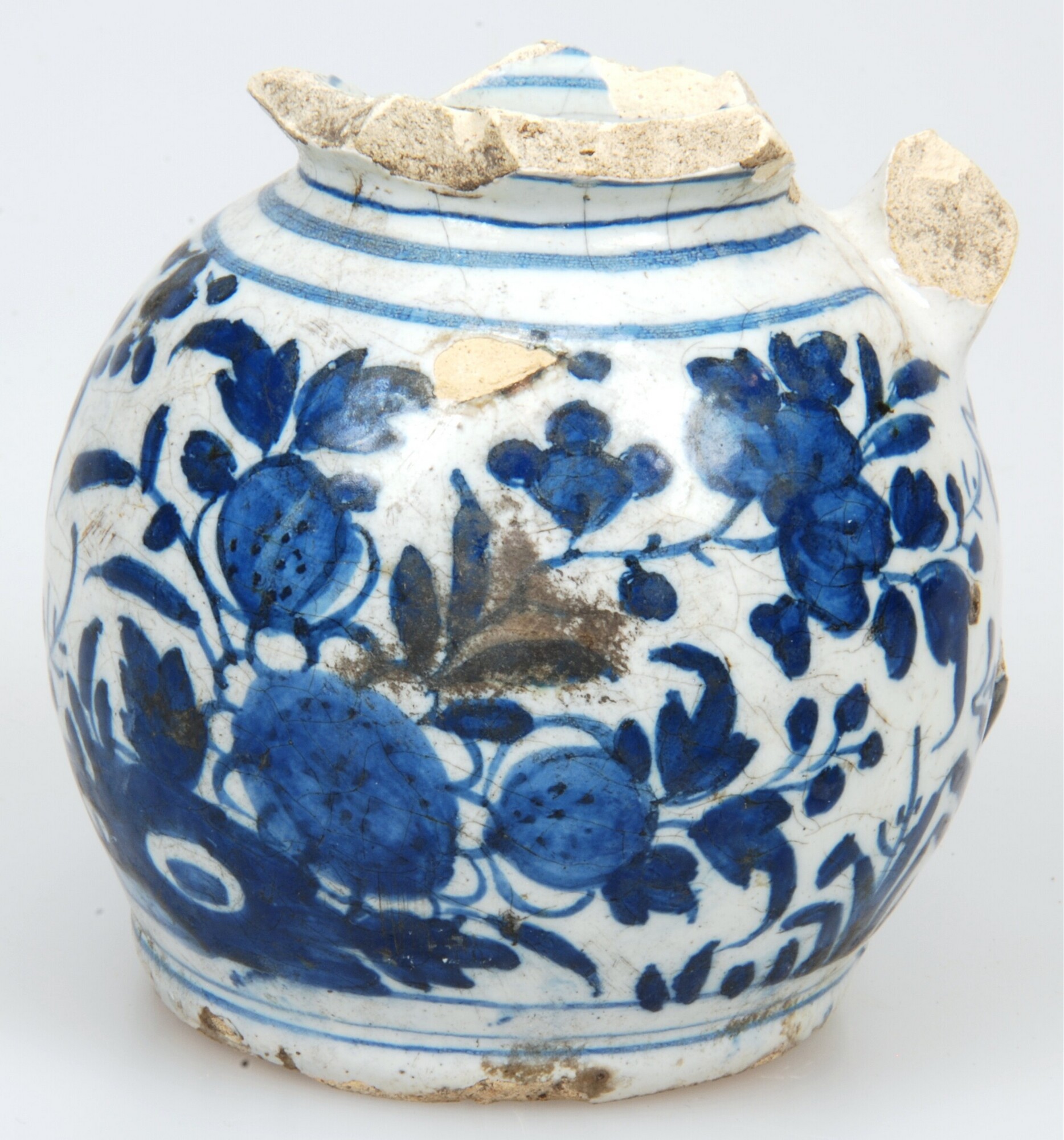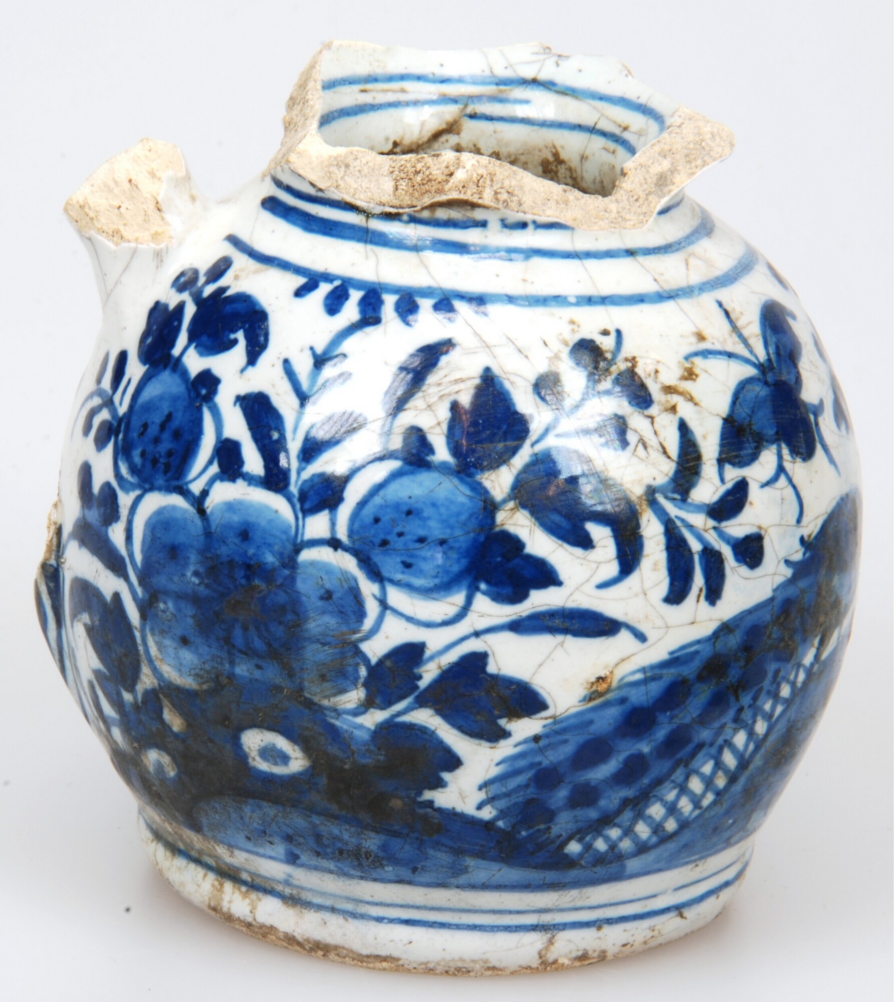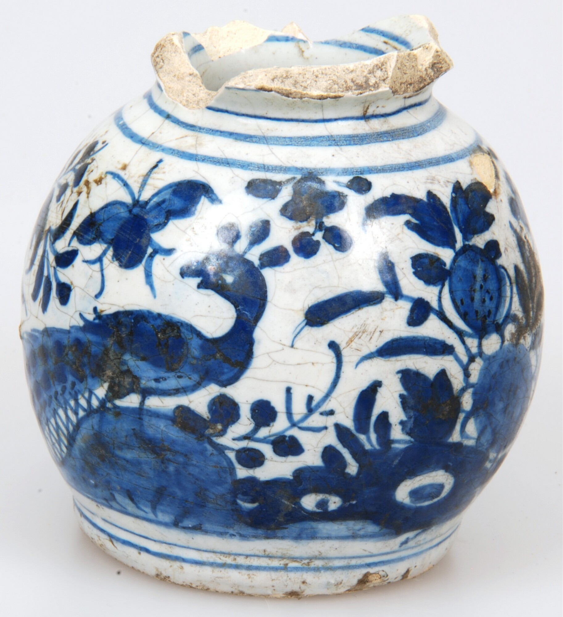 Kwispedoor; f-kwi-2 (?); faience; tinglazuur; blauw, bloemen, vlinder en vogel; standring; merk onderzijde; één vormoor afgebroken; Delft ?