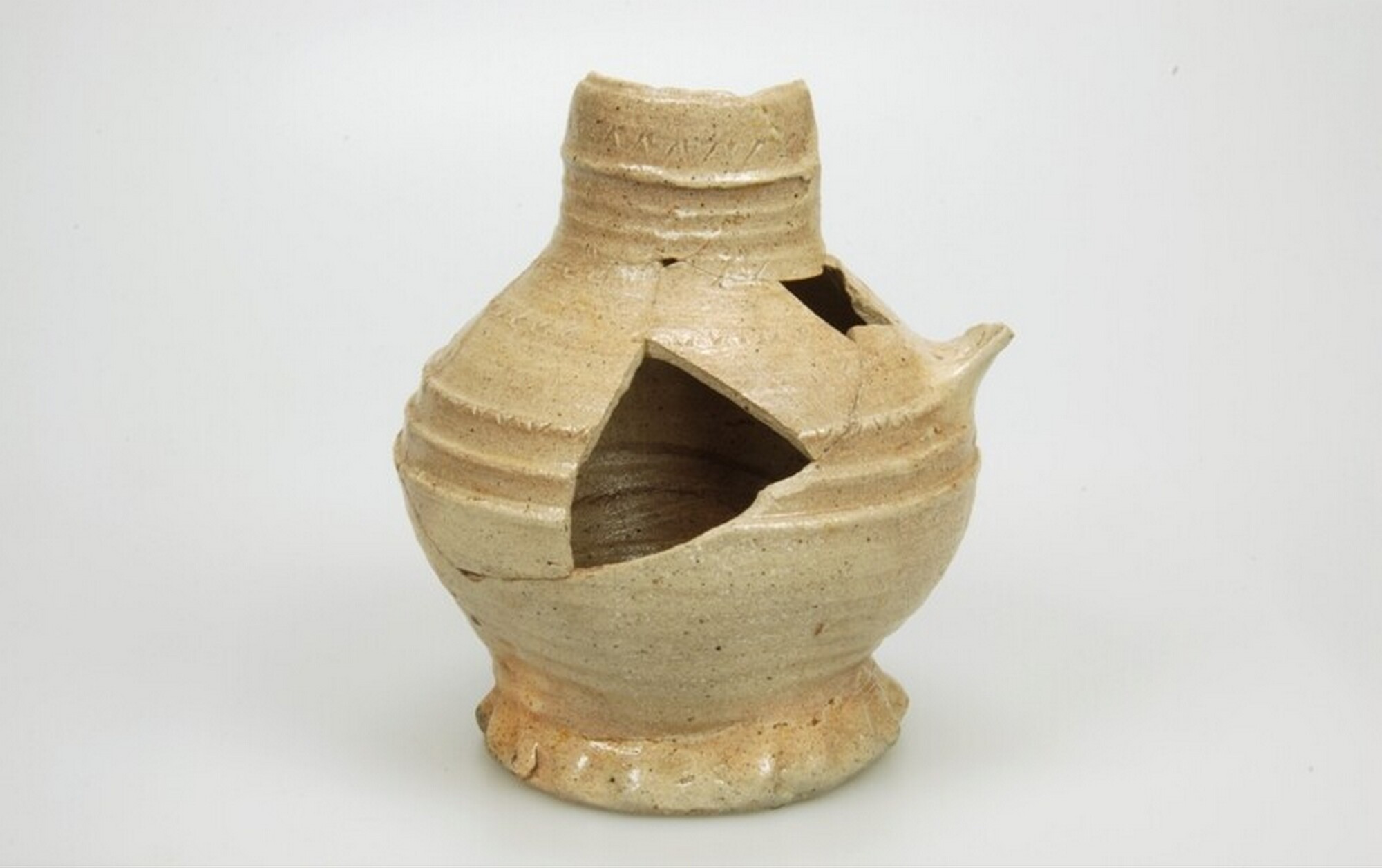 Kan: s2-kan-12; gedrongen bolle kan met kraagrand, geknepen standring, verticaal lintoor (ontbreekt); steengoed met oppervlaktebehandeling: zoutglazuur; gekerfd zigzag-motief op hals en buik; herkomst: Aken of Raeren, Rijnland