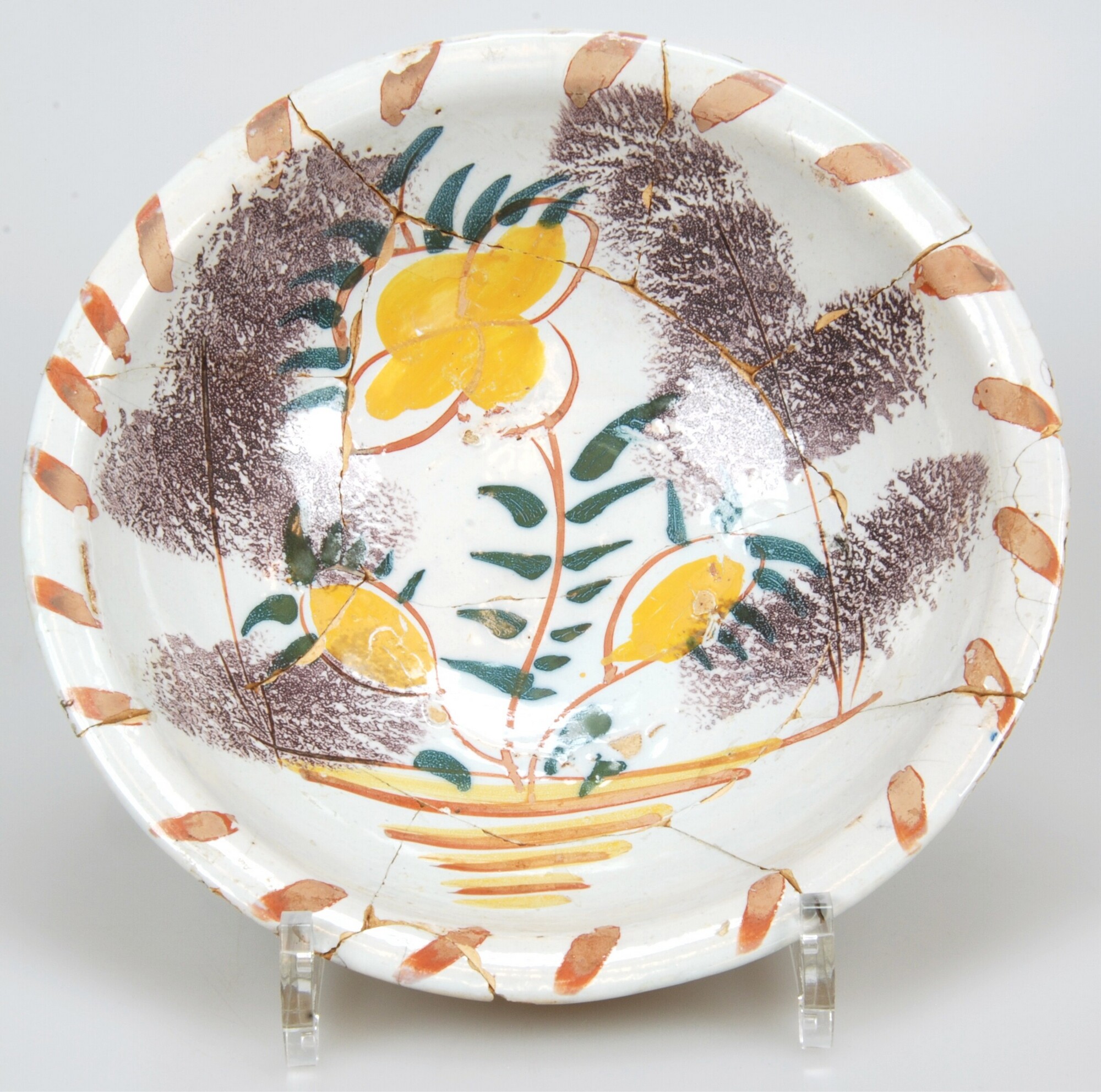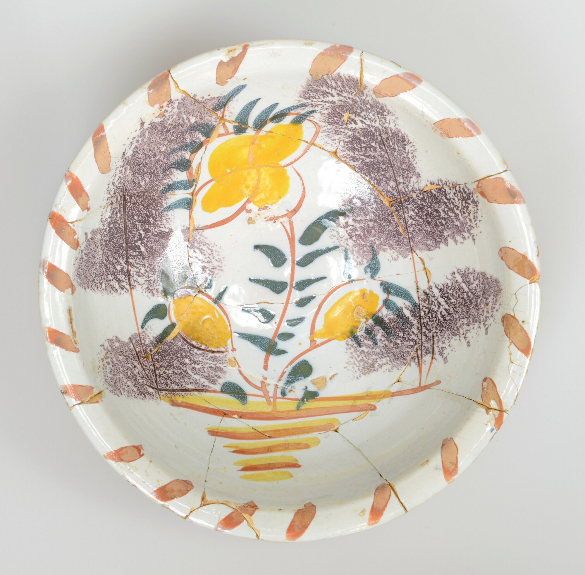 Kom; m-kom-4; bolle kom met rechte rand; majolica; bovenzijde geel/paars/bruin op wit: sp: bloem met daaromheen paarse sponstechniek, vl: oranje strepen; standring