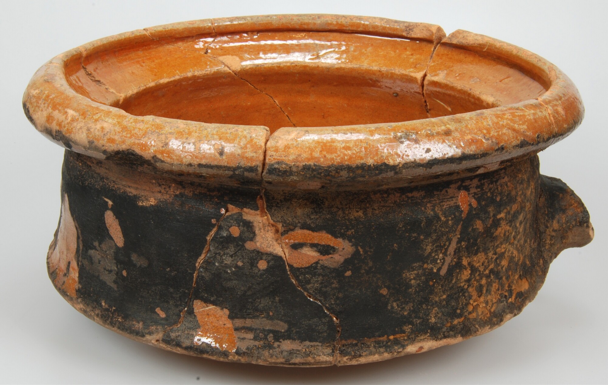 Grape; r-gra-?; roodbakkend; loodglazuur; Bergen op Zoom; sluitpan op poten; handvat ontbreekt; beroet; losse vondst; vondstdatum: 12-9-1994