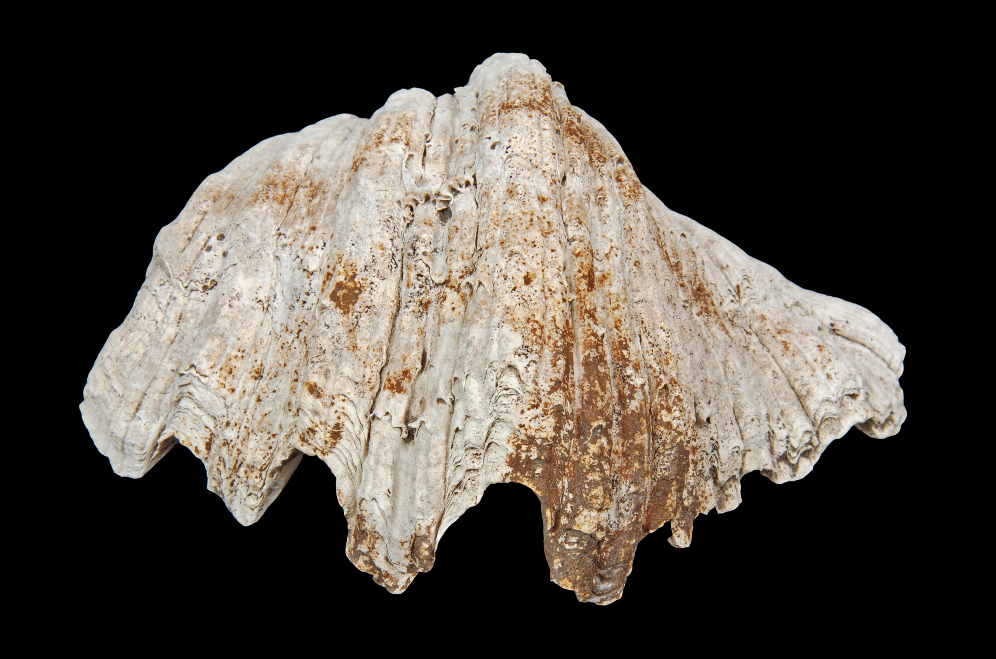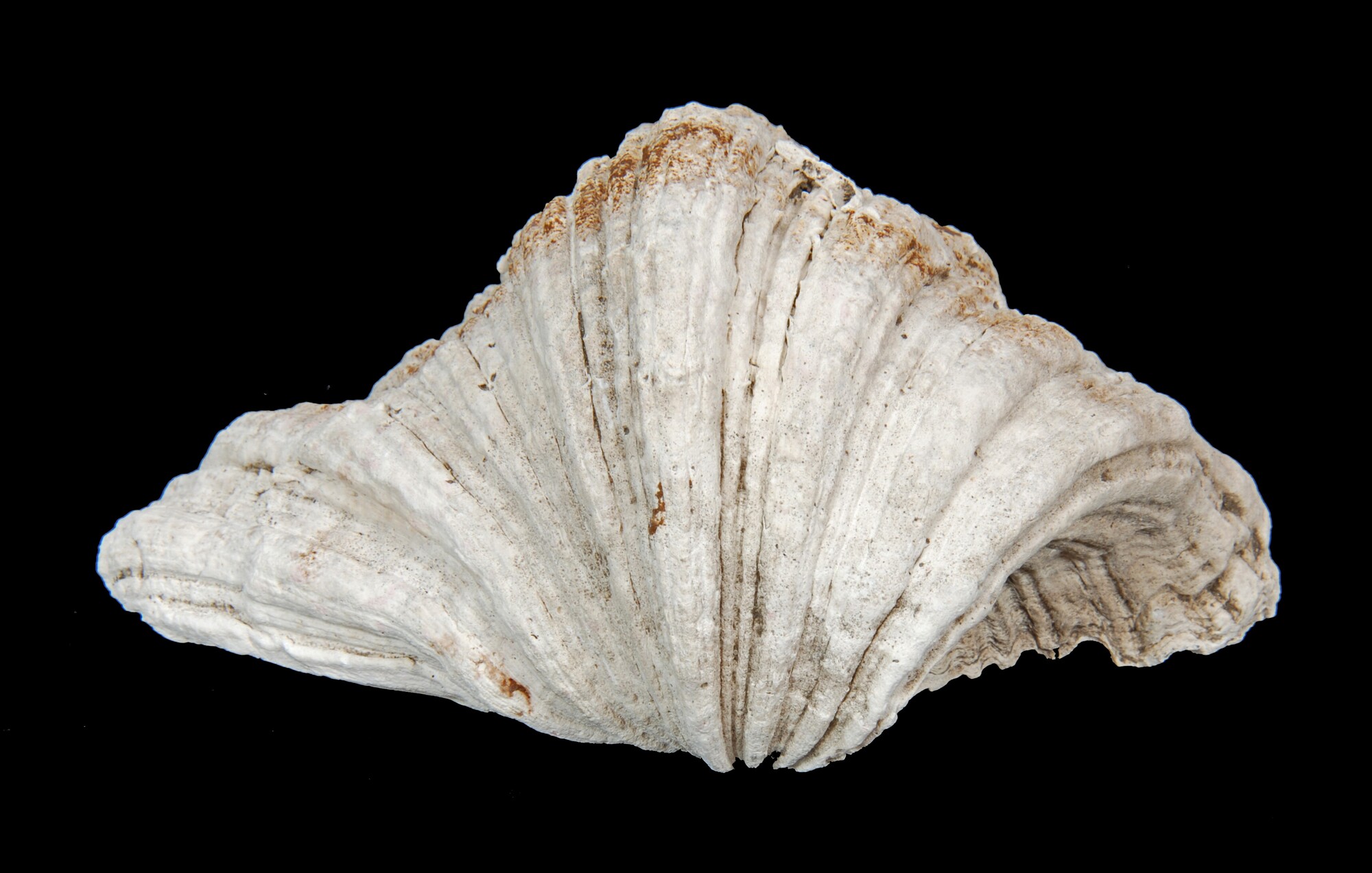 Schelp (Hippopus hippopus); herkomst: Indische Oceaan of westelijke Stille Oceaan; vondstomstandigheden: afkomstig uit schelpengalerij