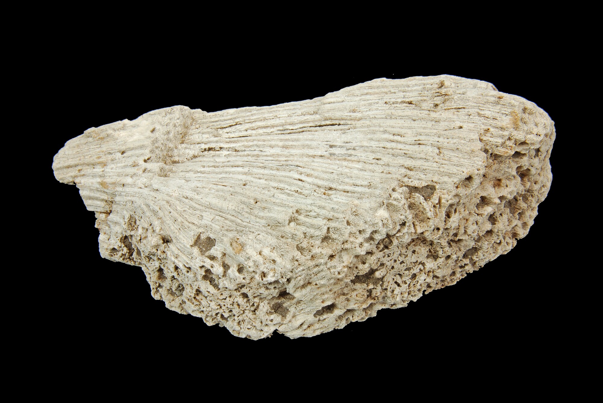 Koraal; kalkskelet van steenkoraal (Orbicella sp); brokstuk; herkomst: Caribische Zee; doorboring in de lengterichting; vondstomstandigheden: afkomstig uit schelpengalerij