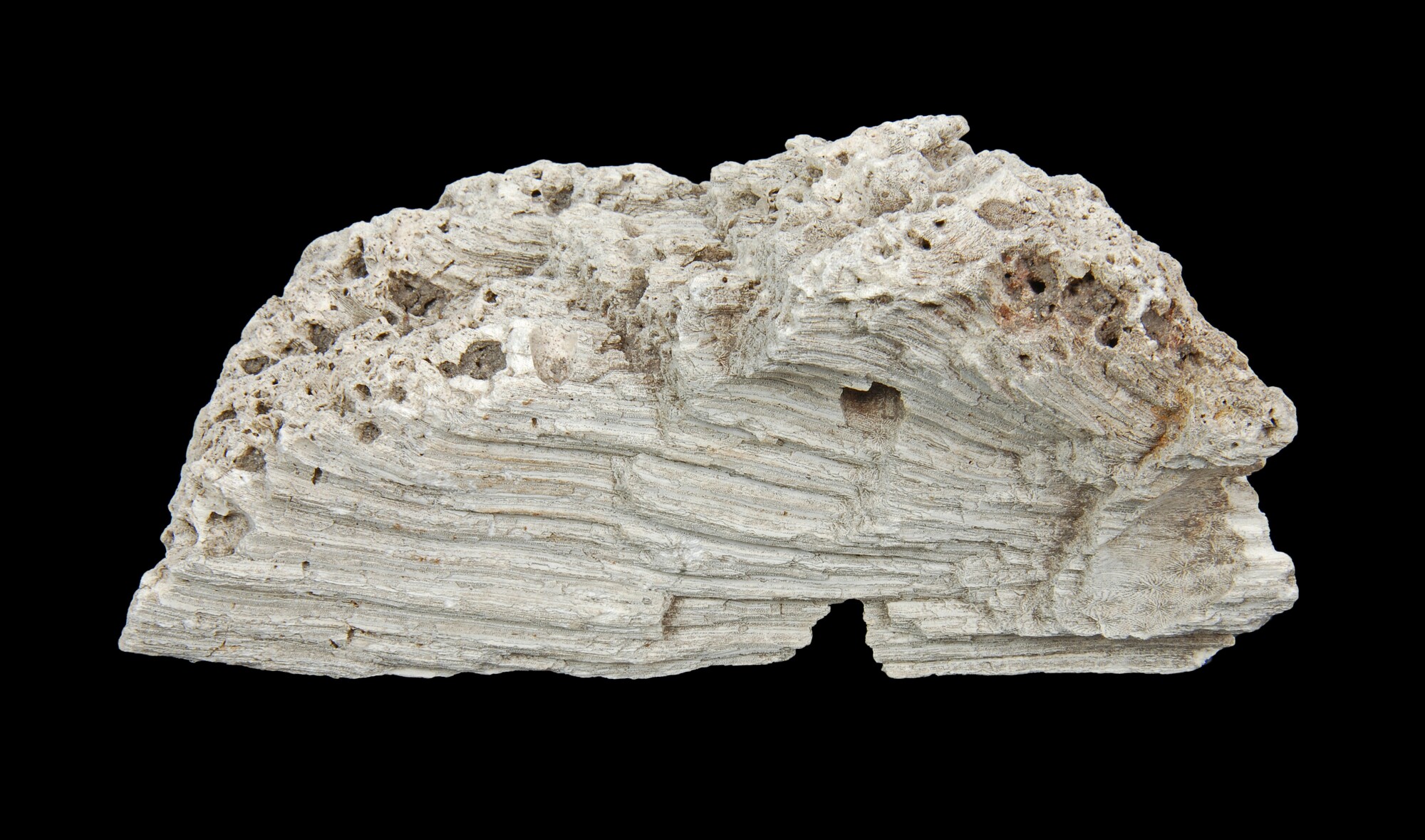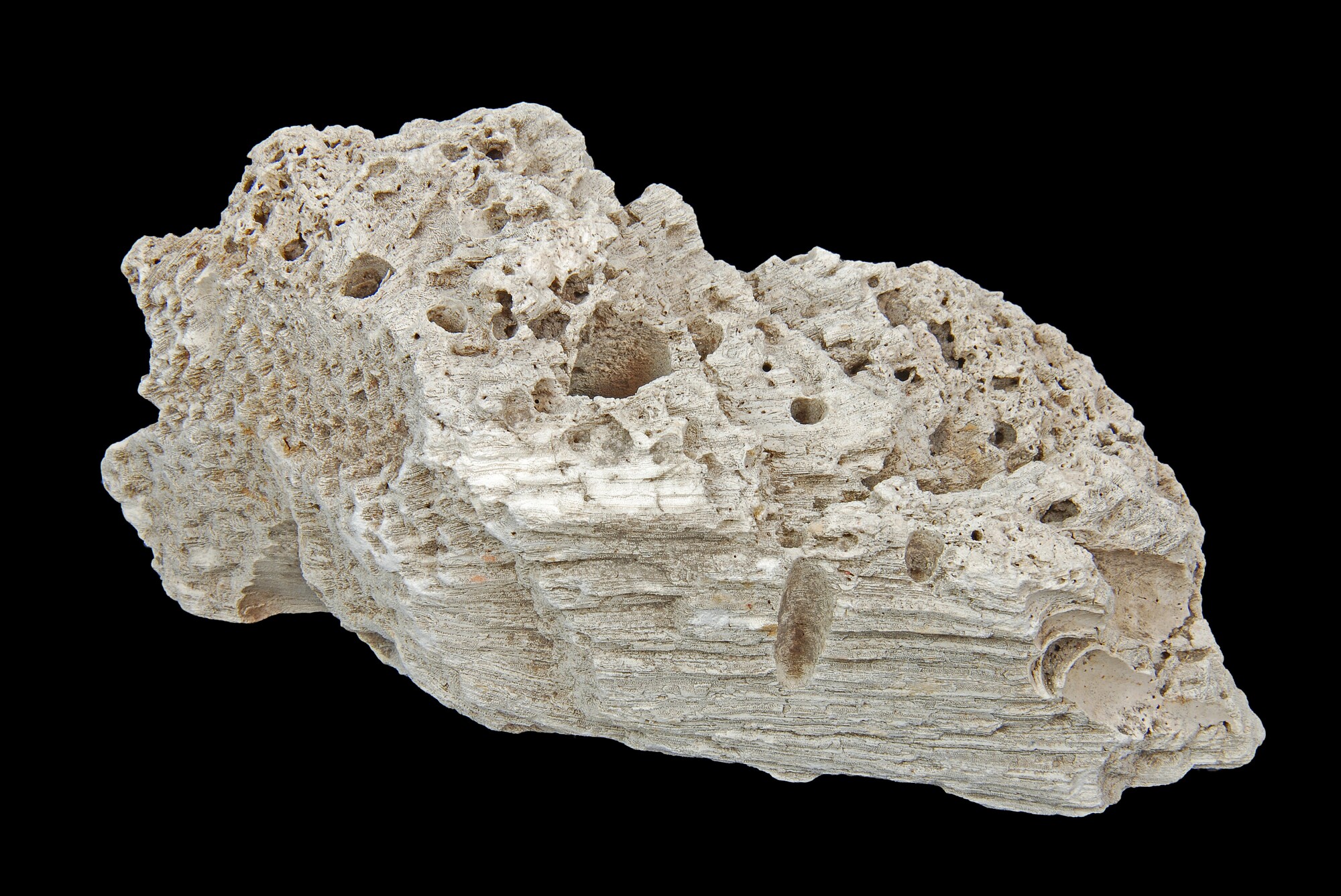 Koraal; kalkskelet van steenkoraal (Orbicella sp); brokstuk; herkomst: Caribische Zee; vondstomstandigheden: afkomstig uit schelpengalerij