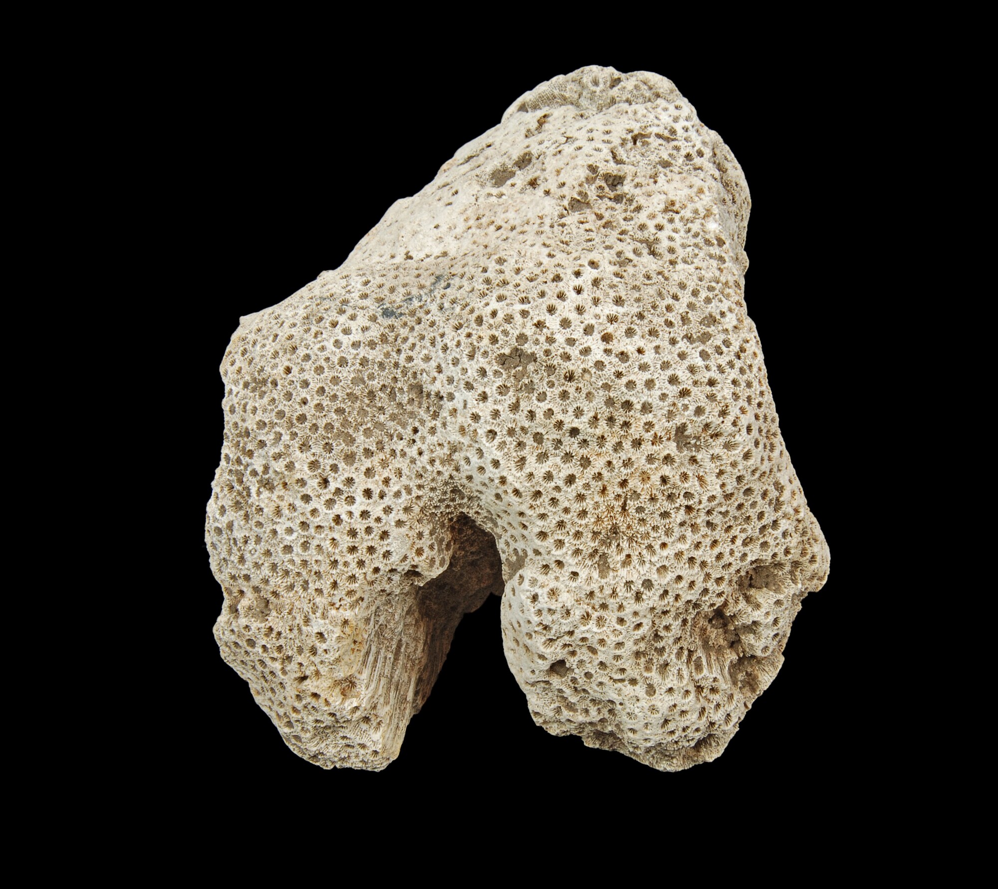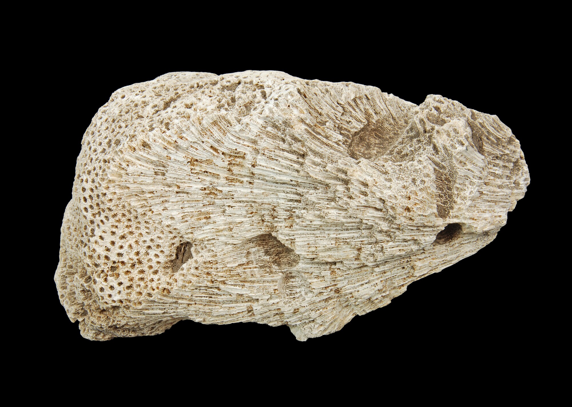 Koraal; kalkskelet van steenkoraal (Montasstraea sp.); brokstuk; herkomst: Atlantische Oceaan en Caribische Zee; vondstomstandigheden: afkomstig uit schelpengalerij