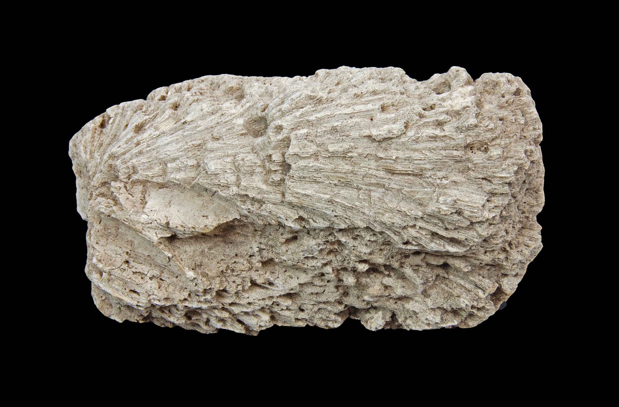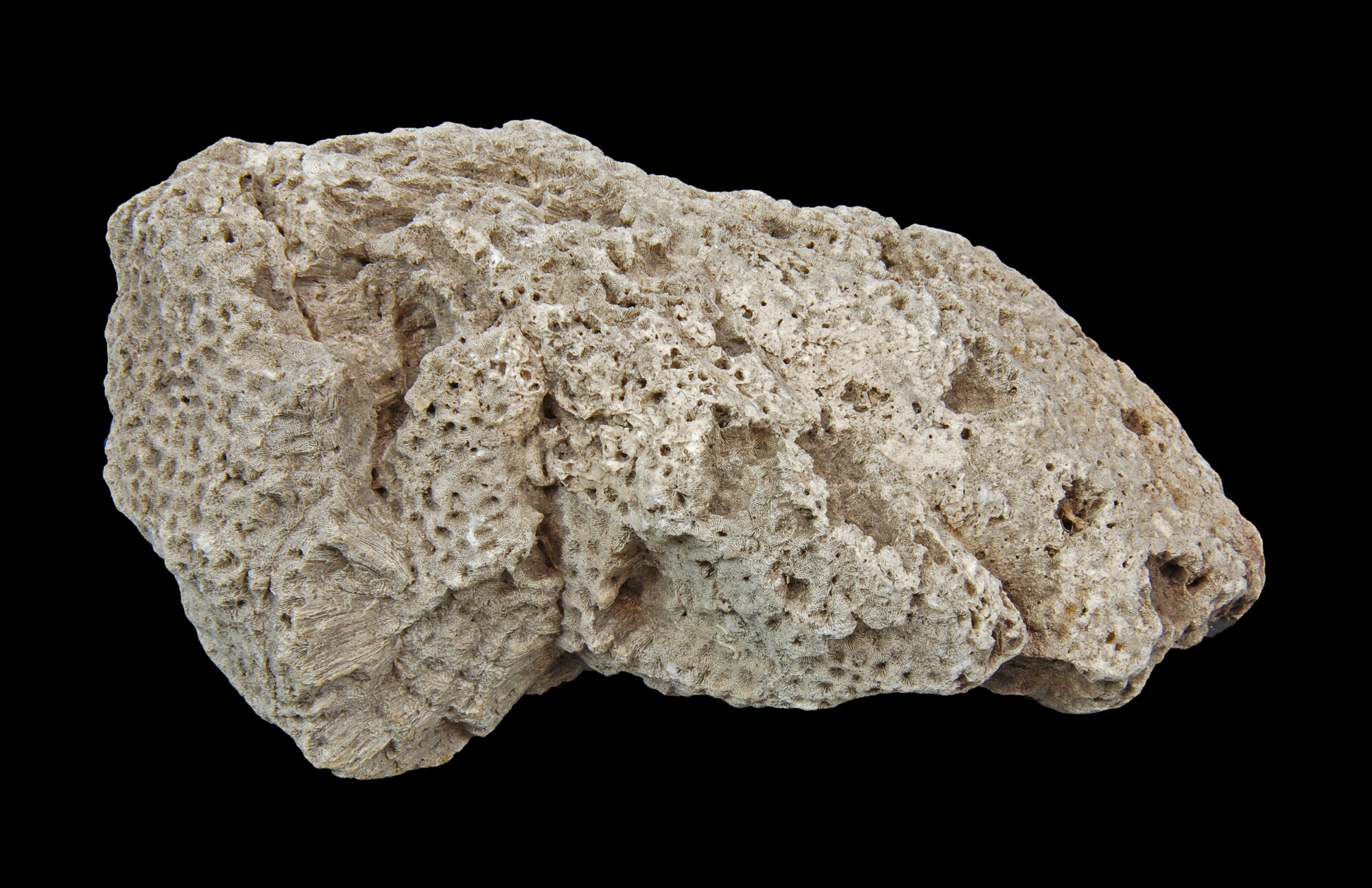 Koraal; kalkskelet van steenkoraal (Siderrastrea sp); brokstuk; herkomst: Caribische Zee; vondstomstandigheden: afkomstig uit schelpengalerij
