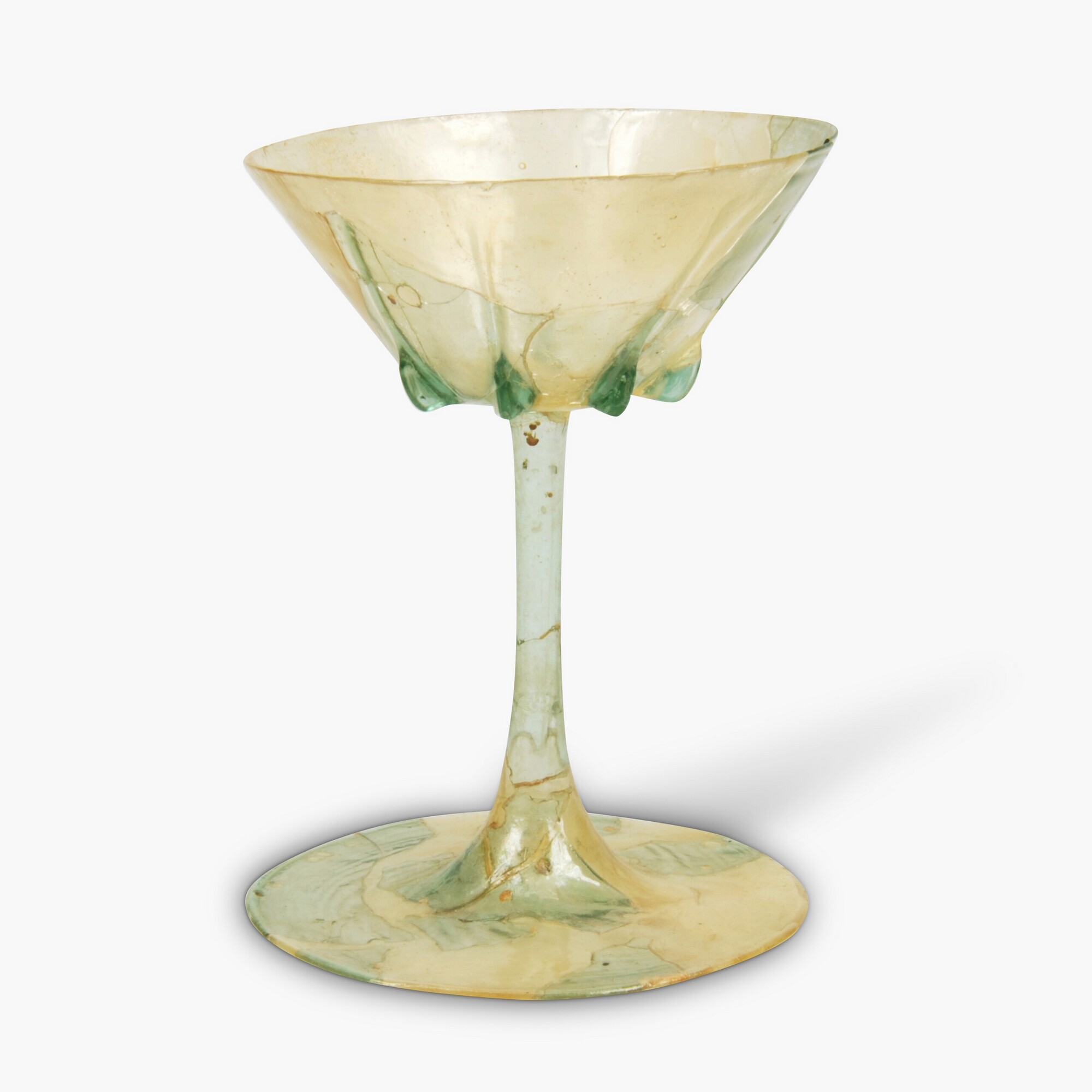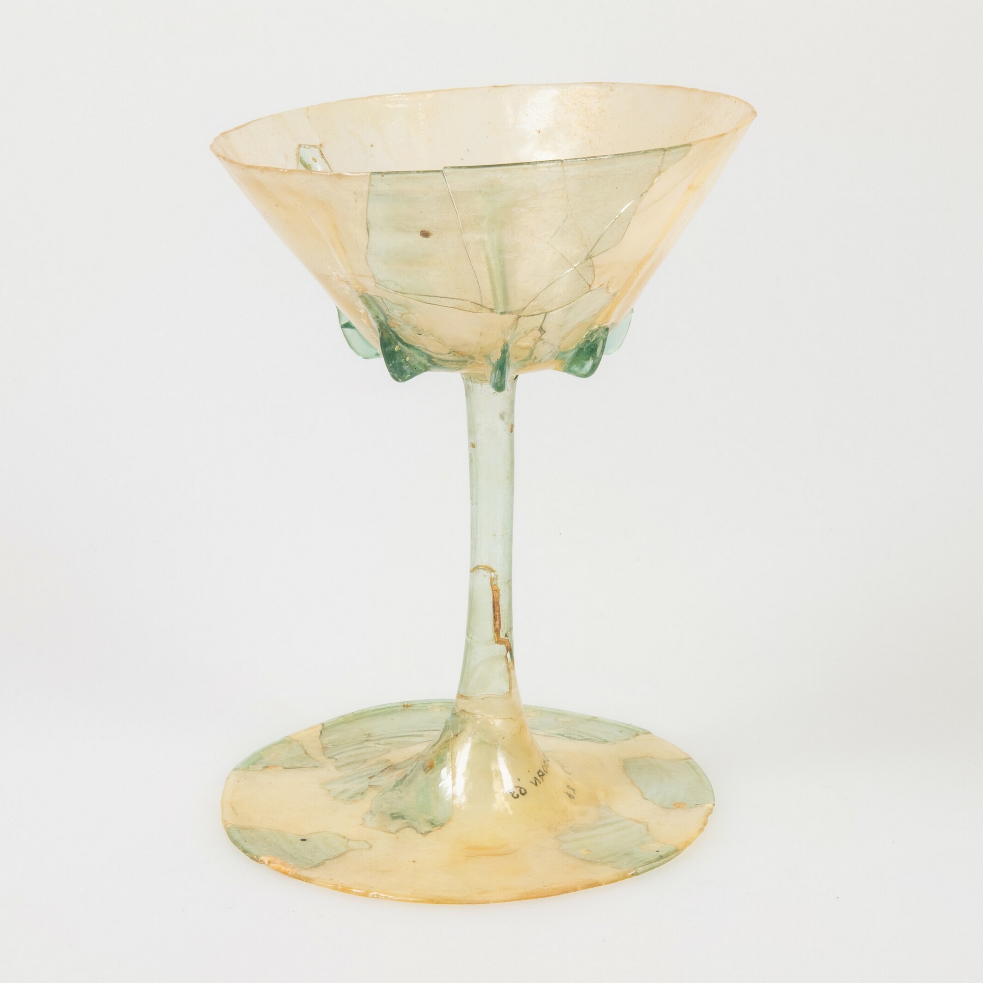 Kelk- of stengelglas; type Foy b2; tweedelig glas; trechtervormige kelk, hoge holle stam, brede schijfvormige voet; kleurloos glas met groene zweem; onderzijde kelk versierd met ribben; herkomst: Maas-Rijnstreek