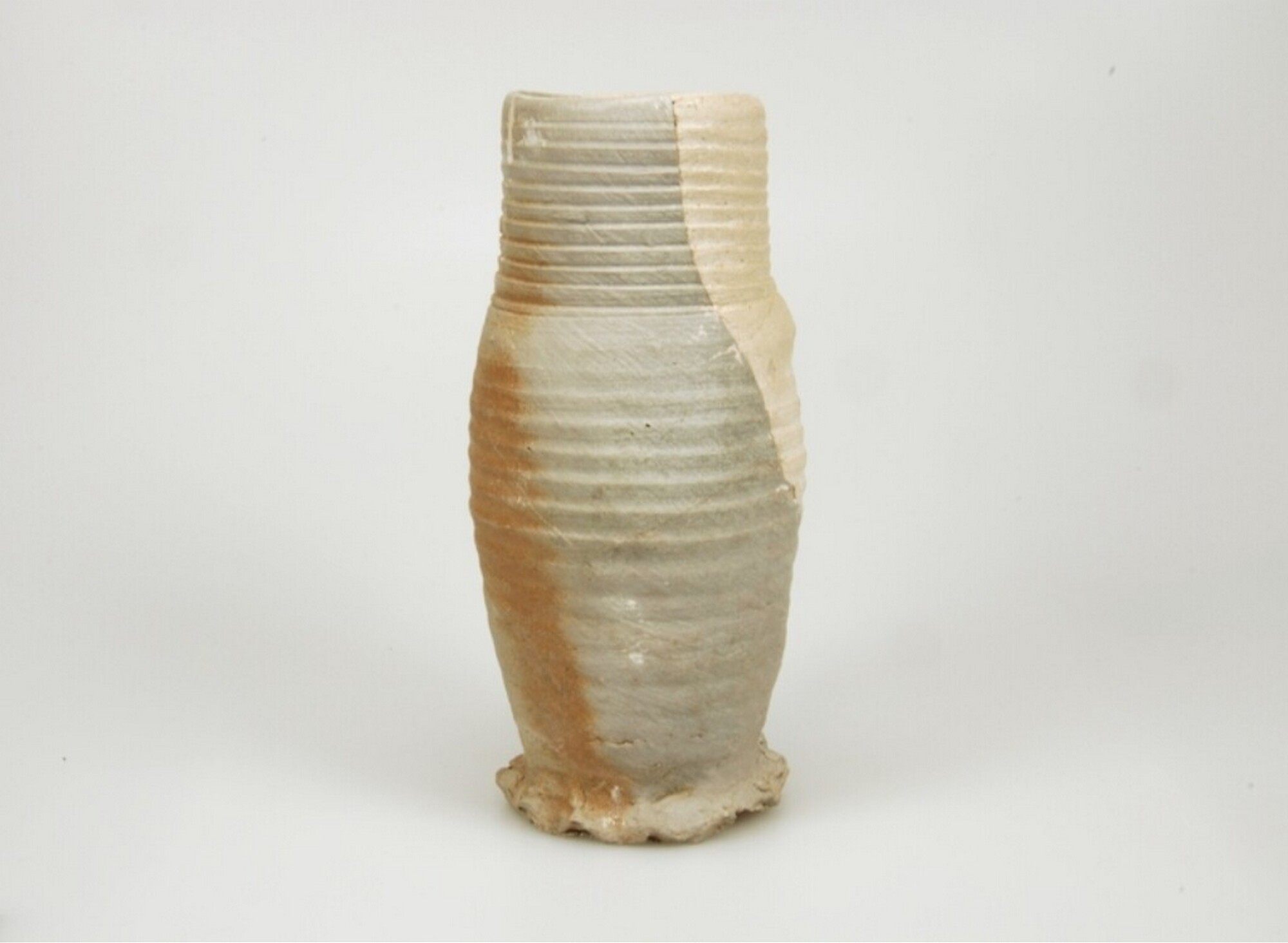 Kan; s1-kan-8; steengoed; standring geknepen; één lintoor; wijdmondig, licht gewelfde buik, vage knik op halsaanzet met rechte rand, draairingen; herkomst: Siegburg, Rijnland