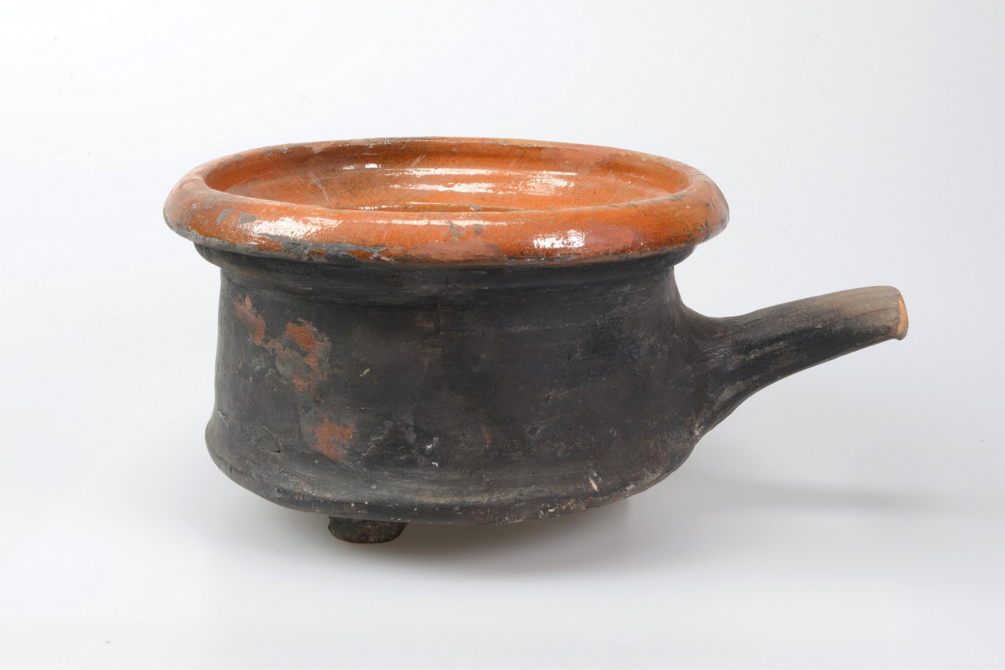 Grape; sluitpan; diepe pan met scherpe knik van bodem naar verticale wand, naar buiten geknikte verdikte rand met dekselgeul; herkomst: Bergen op Zoom?