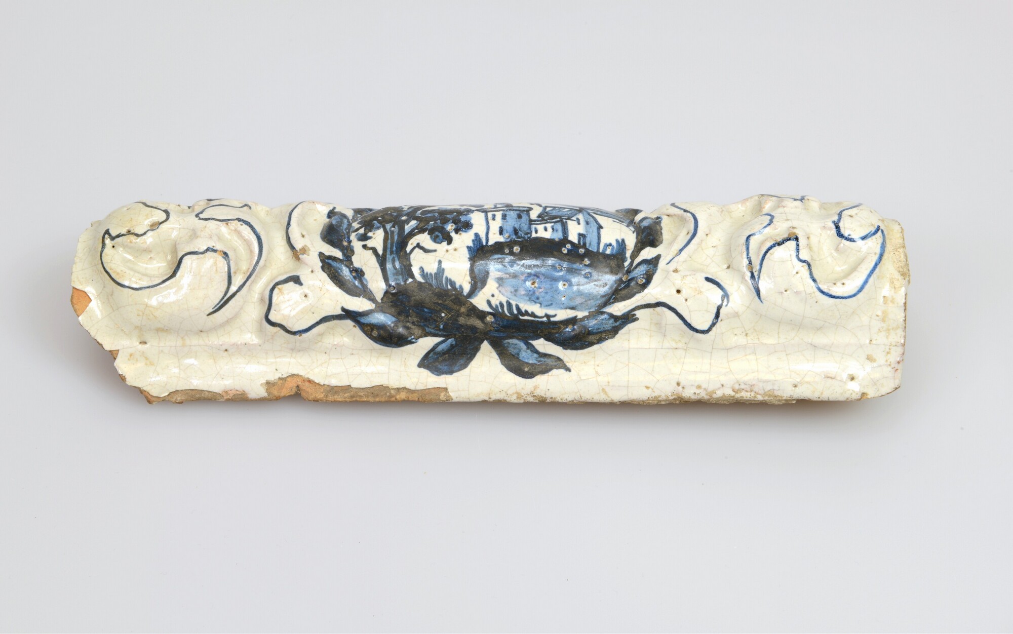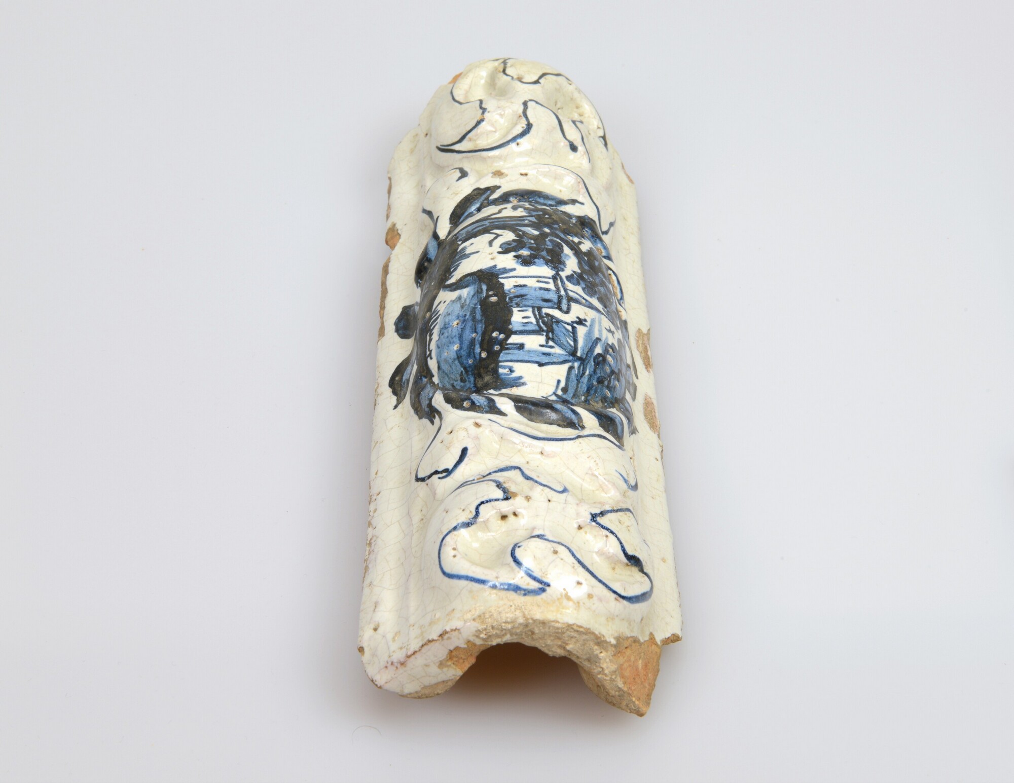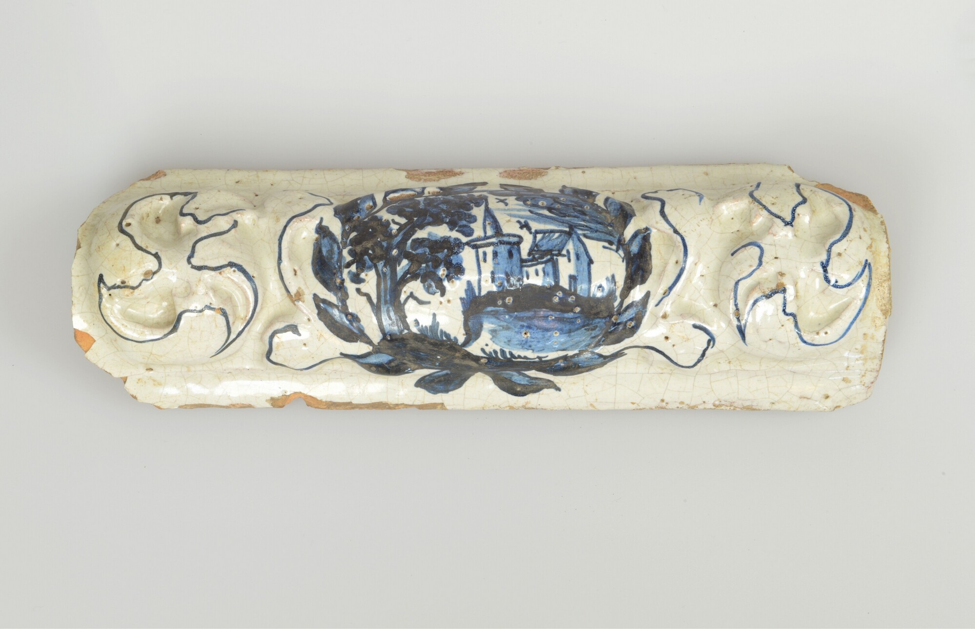 Kacheltegel; faience; uitwendig tinglazuur; rechthoekige, in de lengte halfrond hoekelement van een tegelkachel, accanthusbladeren in reliëf rond ovale cartouche; blauwe beschildering: landschap met kerk en bomen binnen bladerkrans; herkomst: Duitsland of Zwitserland