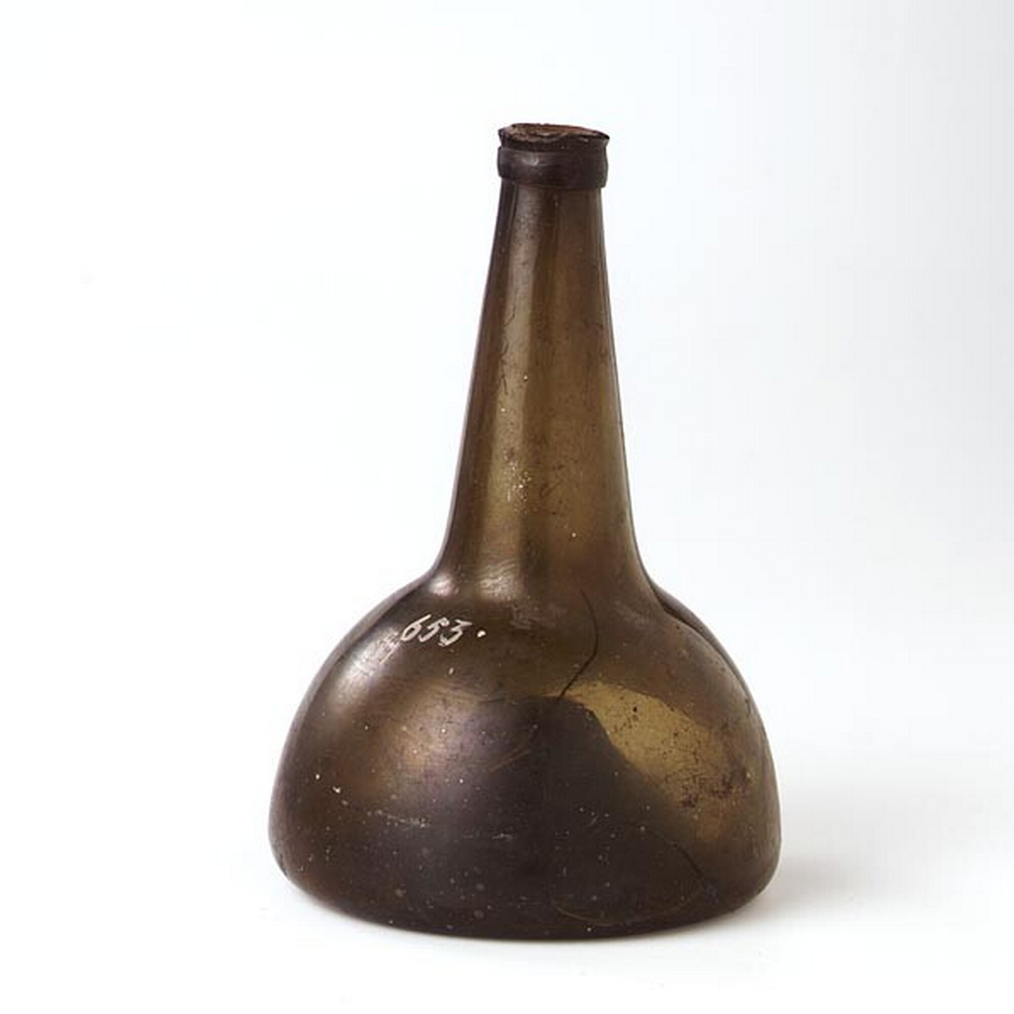 Wijnfles:hoge hals, opgebolde bodem