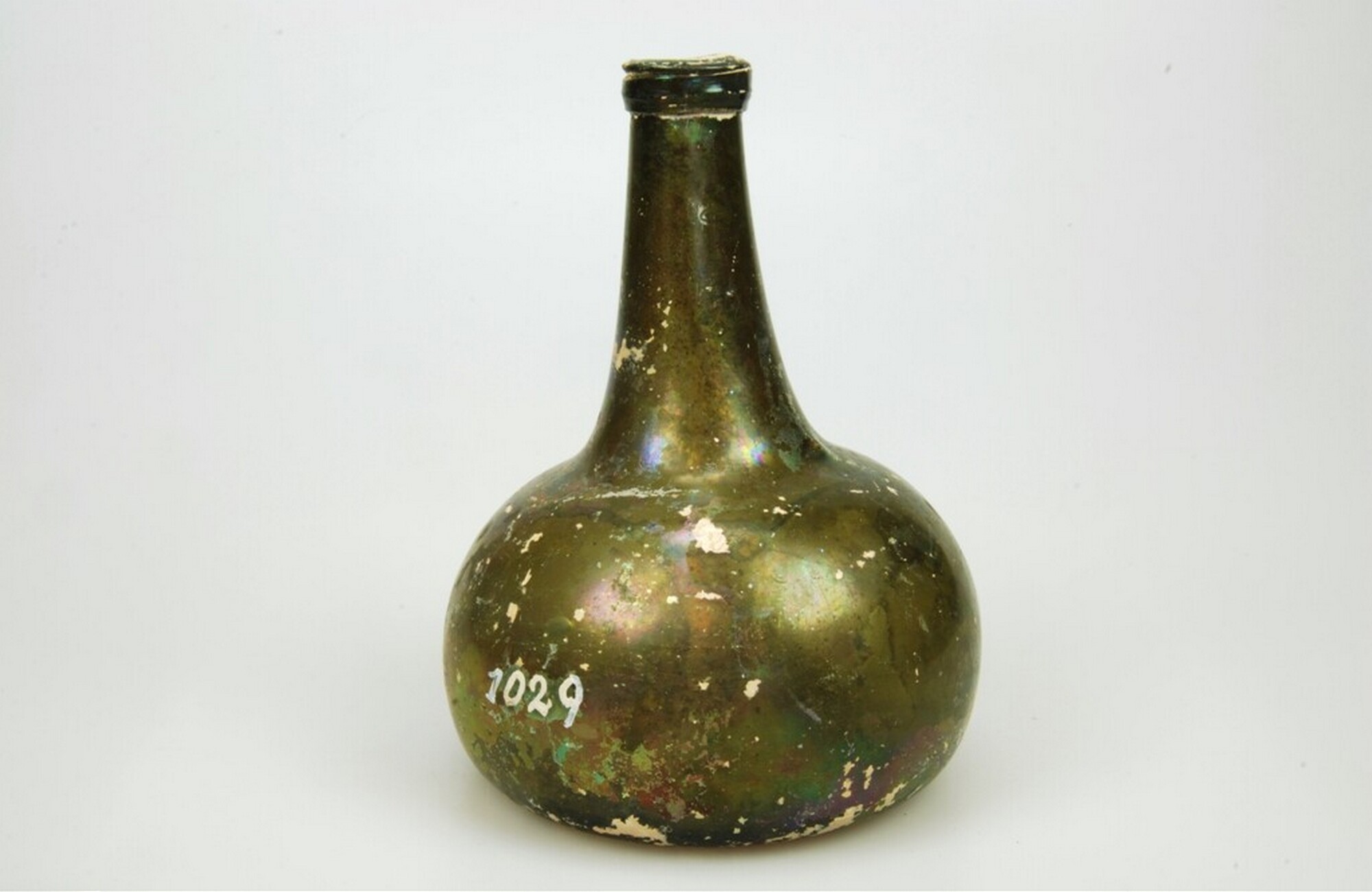 Wijnfles:hoge hals, opgebolde bodem