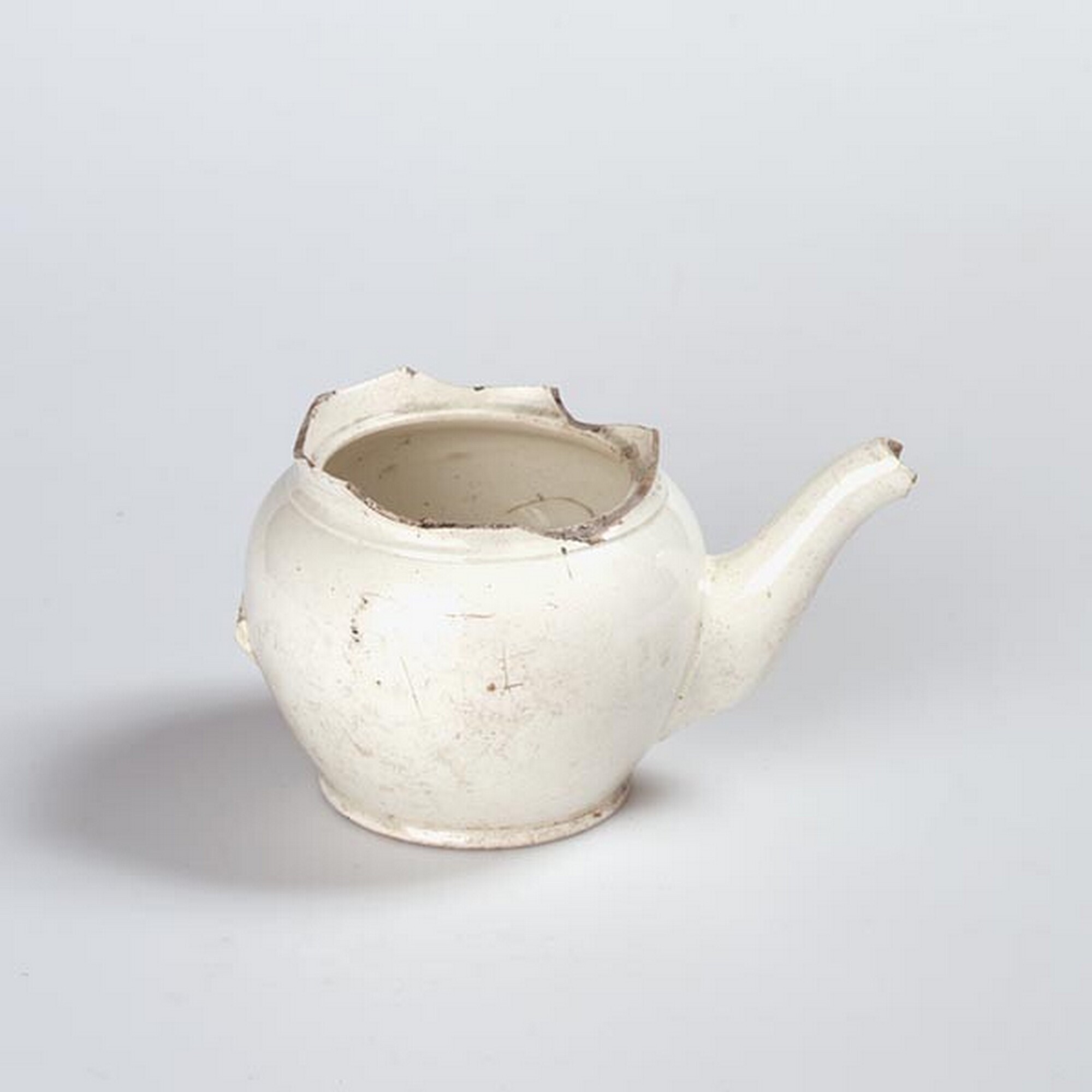 Theepot; iw-the-3; lampionvormige theepot met hoge rand, standring; industrieel wit aardewerk (whiteware); vrijwel compleet; Engeland