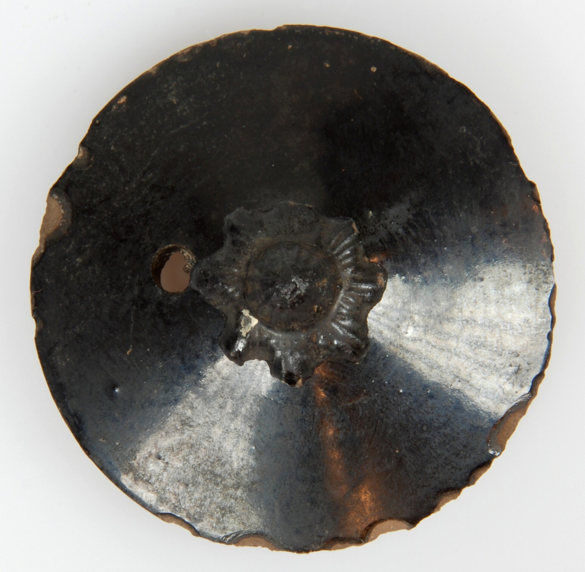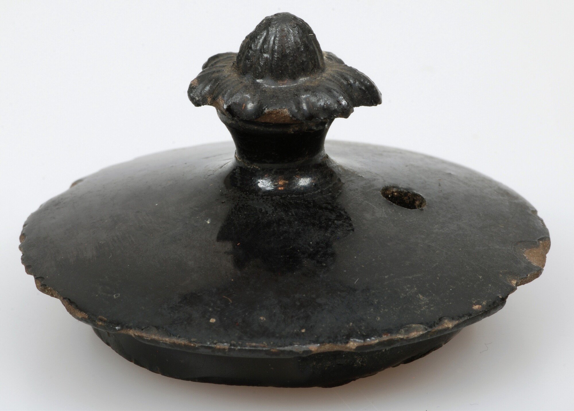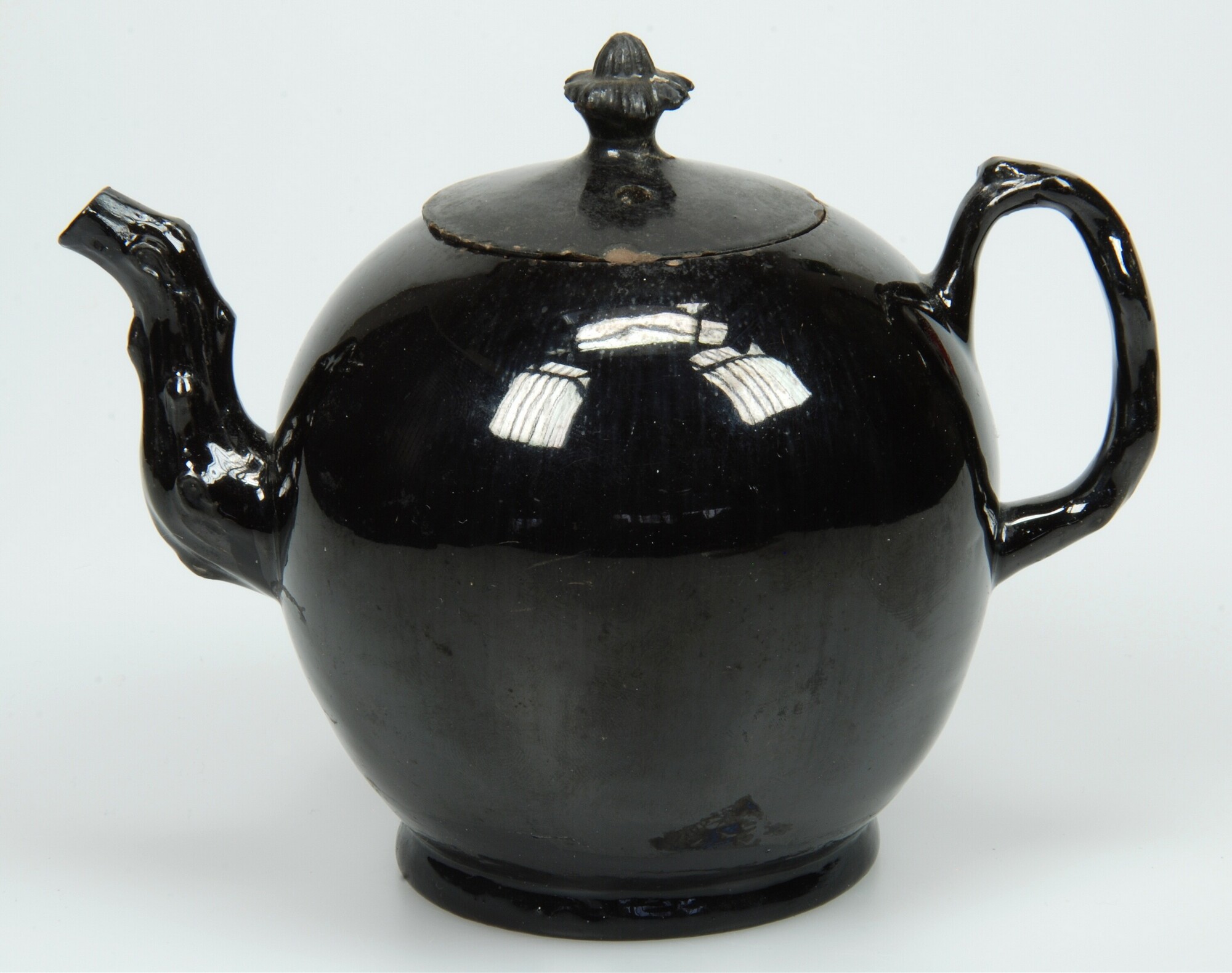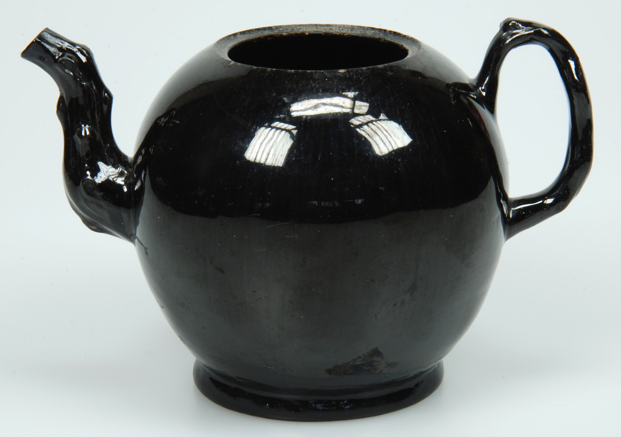 Theepot; iz-the-3; bolle theepot met dekselgeul, standring; deksel; iz-dek-1; bol deksel met sluitrand en knop; industrieel zwart aardewerk (Jackfield blackware); herkomst: Engeland, vermoedelijk Staffordshire