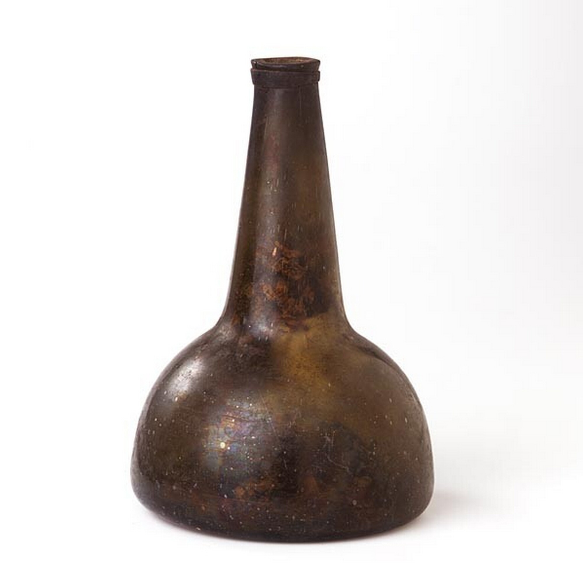 Wijnfles:hoge hals, opgebolde bodem