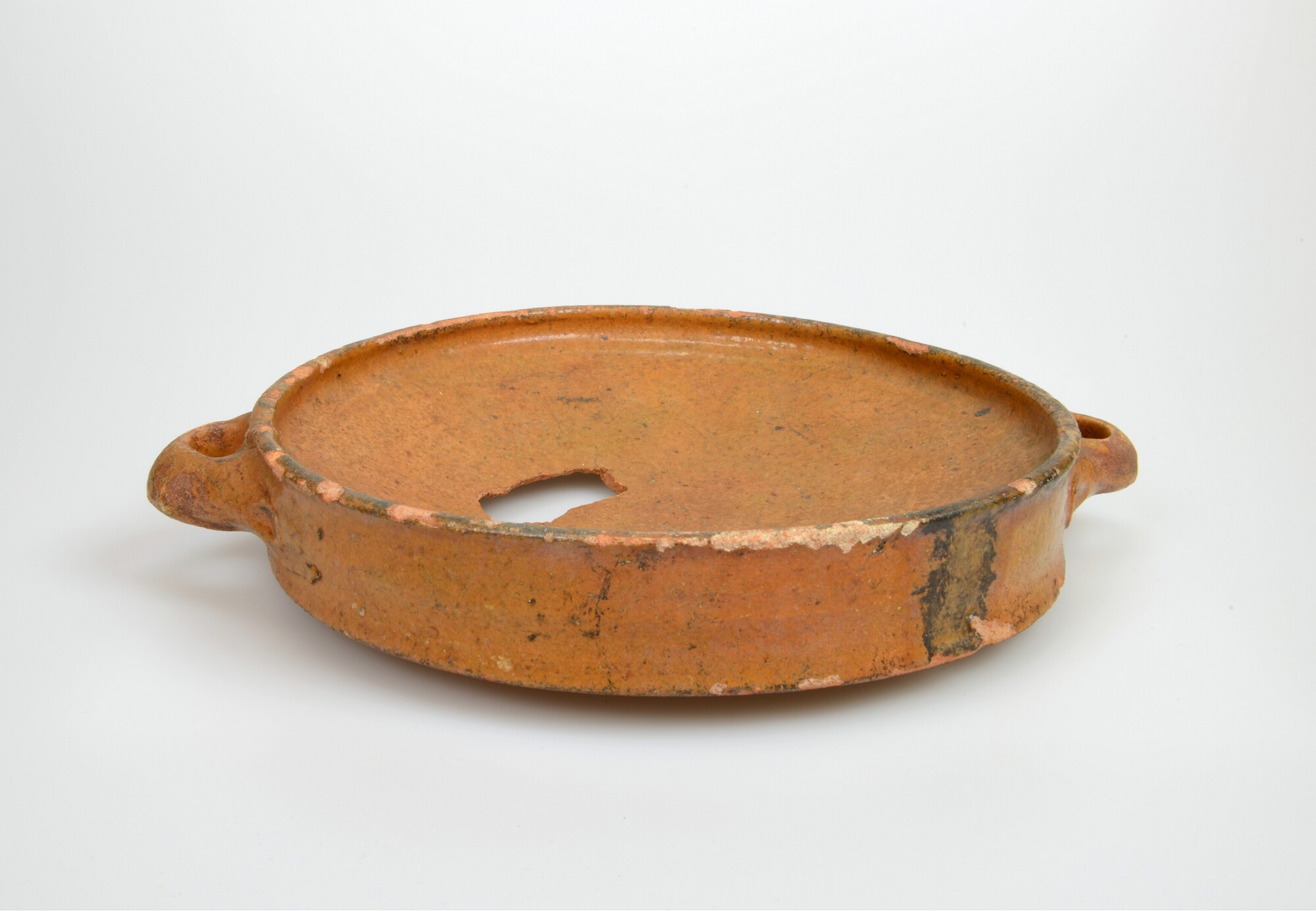 Deksel; r-dek-9; roodbakkend; loodglazuur, deksel voor een slutpan, compleet; Friesland?