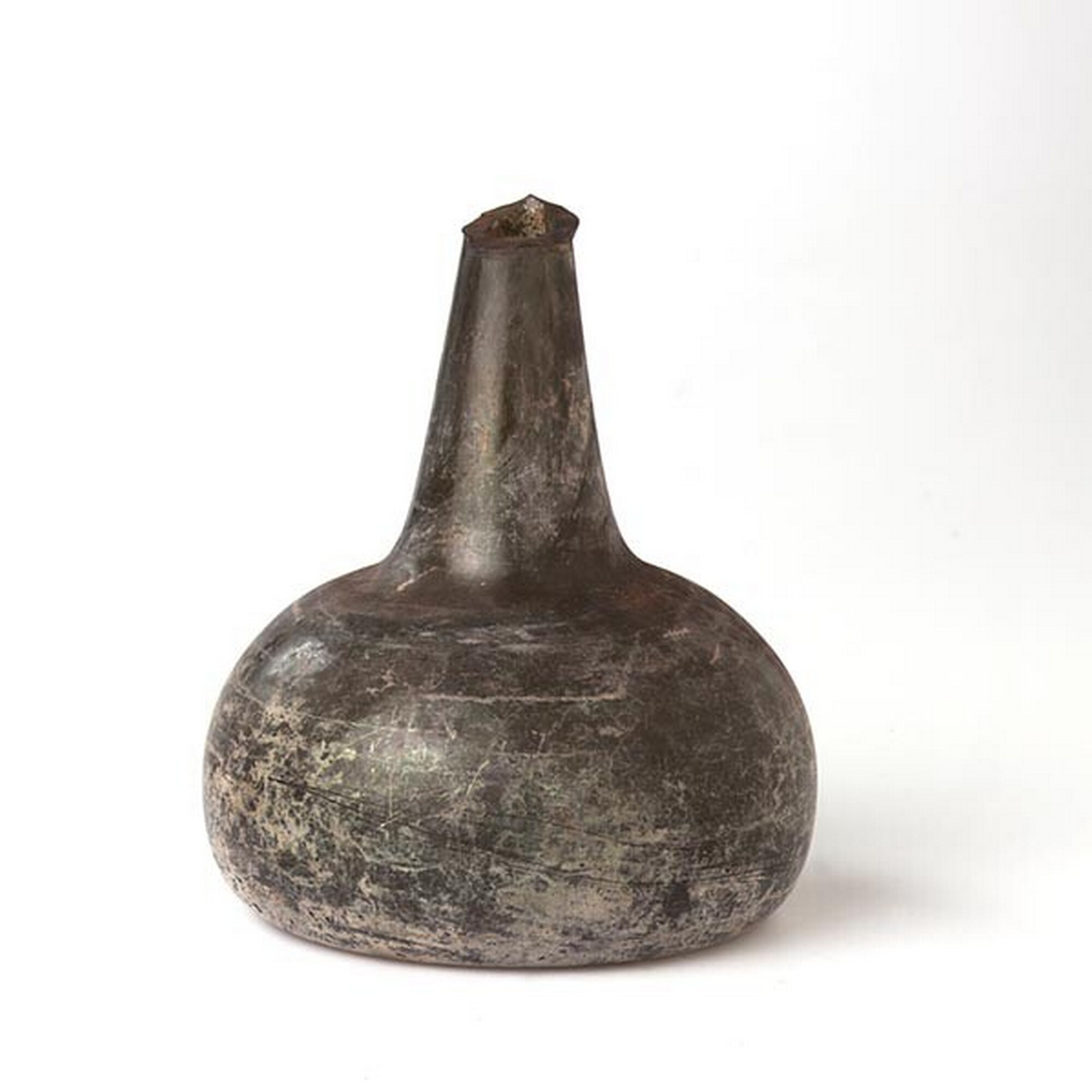 Wijnfles:hoge hals, opgebolde bodem