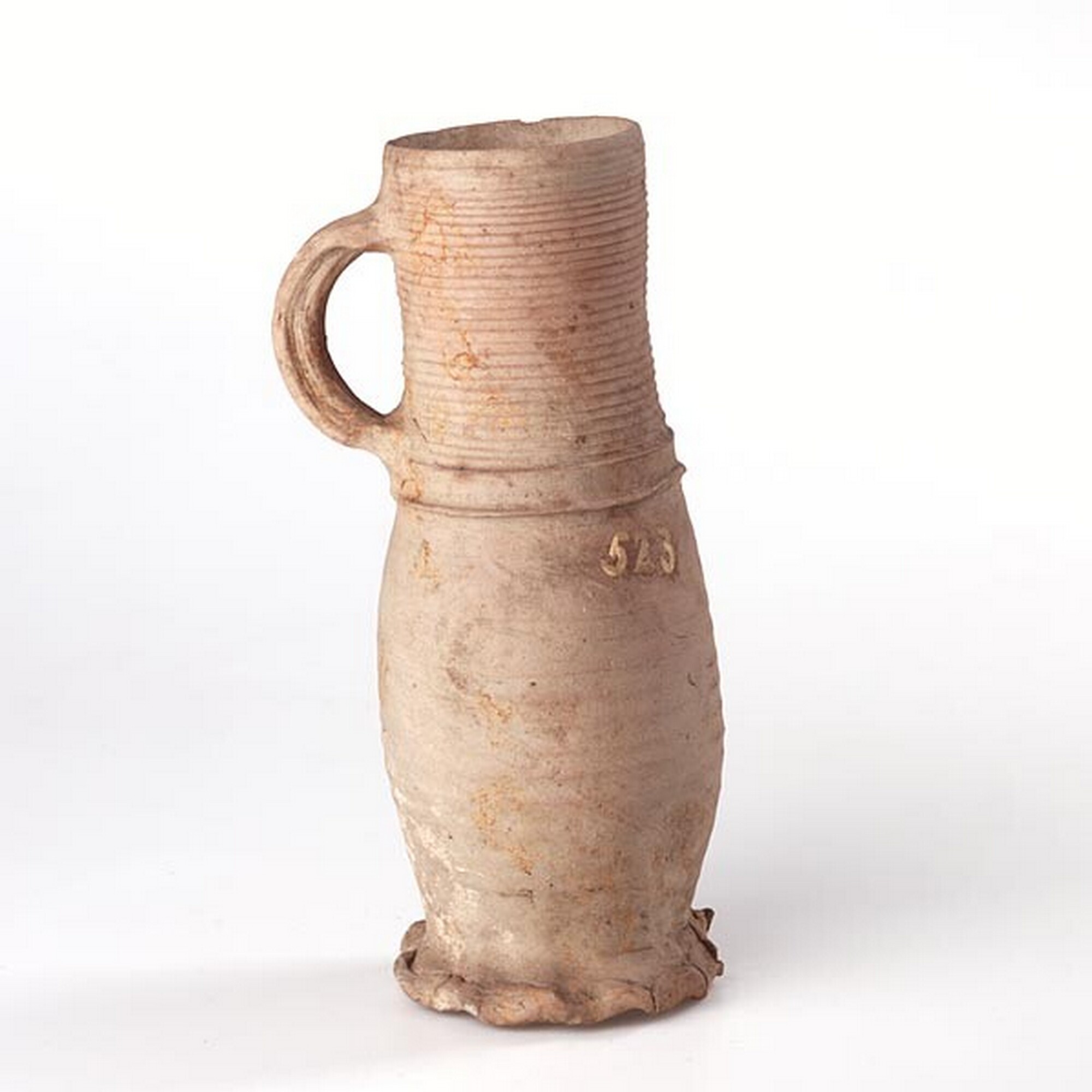 Drinkkan; s1-kan-23; steengoed zonder glazuur; oranje gevlamd; compleet; Siegburg
