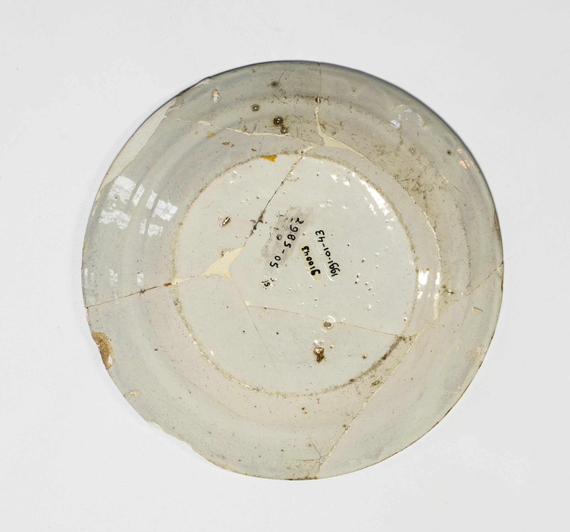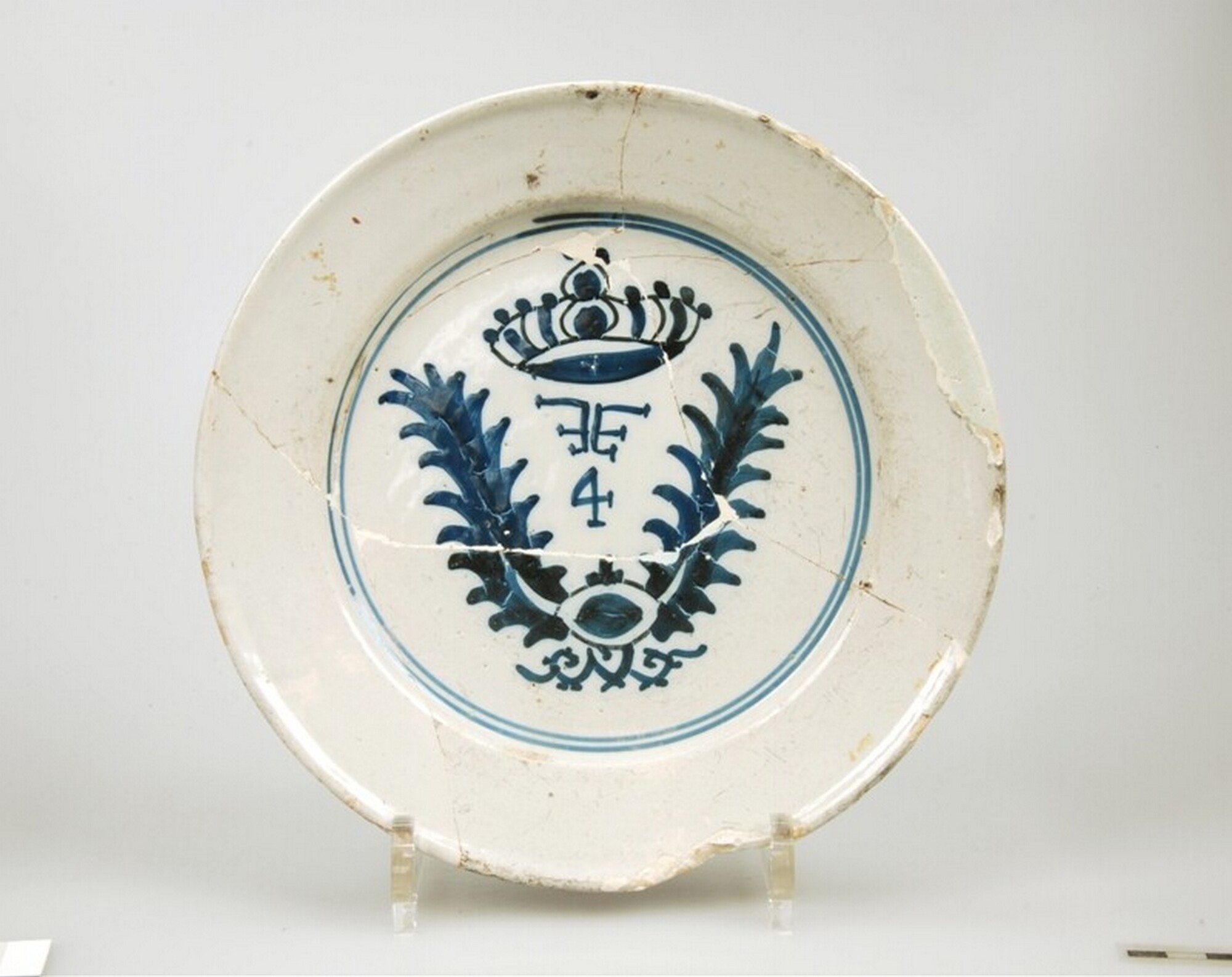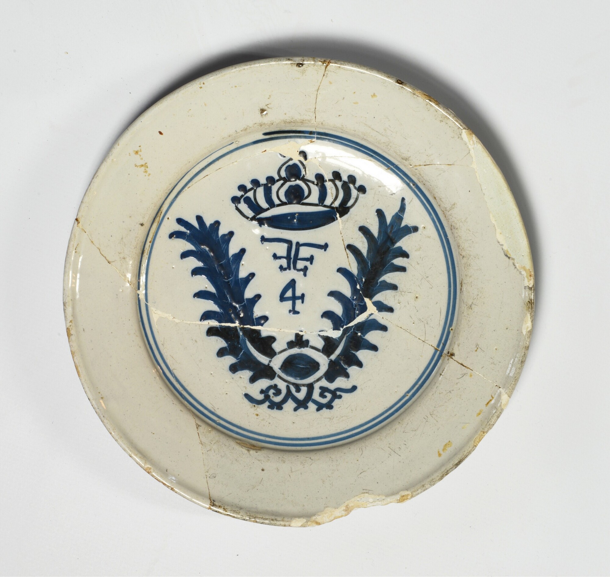 Bord; f-bor-6; afgerond bord met platte bodem en knik spiegel-vlag, smalle iets holle vlag; faience; tinglazuur; blauw: sp: gekroonde FF4 (dubbel monogram Koning Frederik IV van Noorwegen en Denemarken) binnen twee lauwertakken; standvlak.