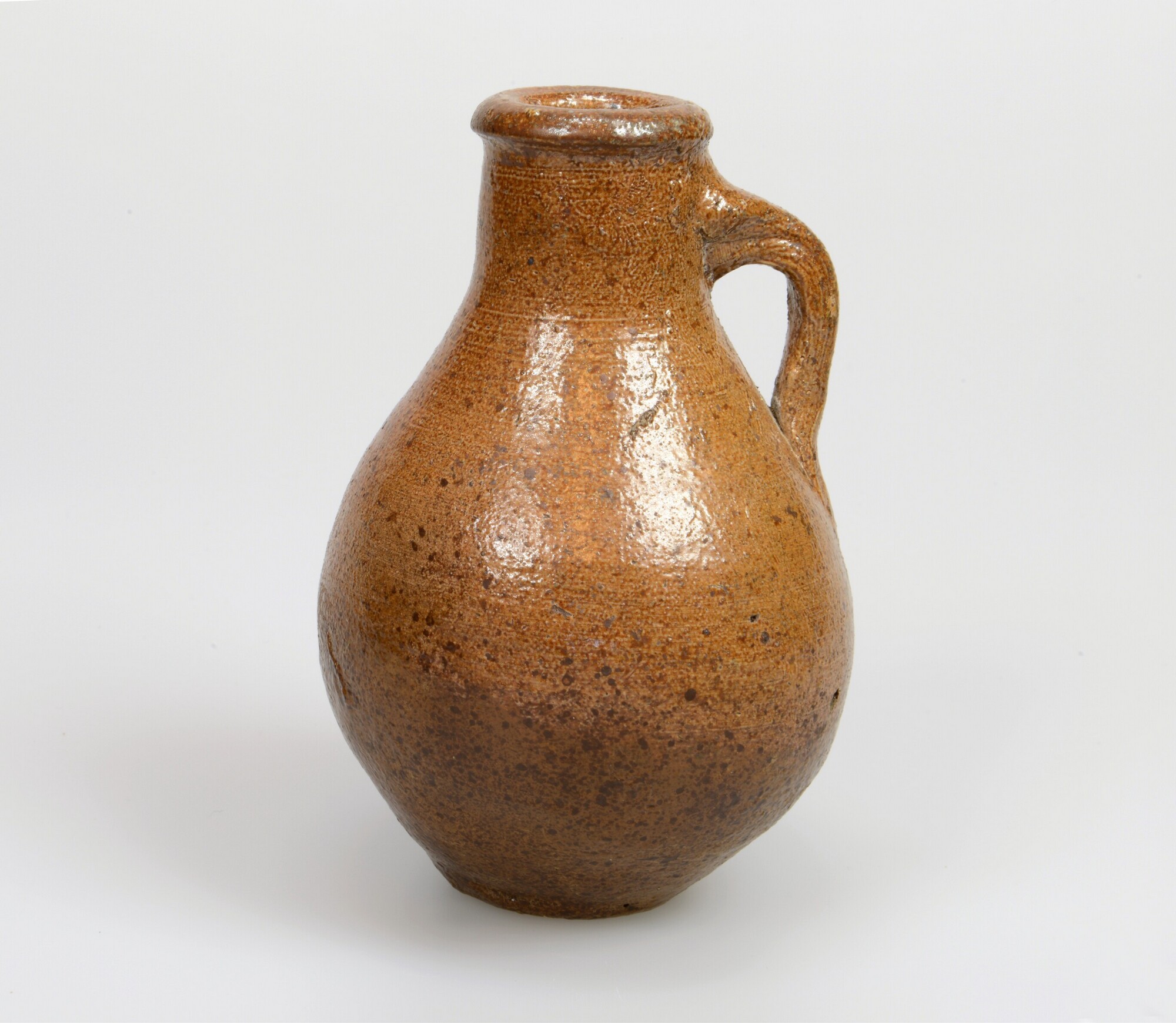 Kan; s2-kan-44; bolle kan met hoge cilindrische hals, met groef onderlangs de rechte rand; steengoed met zoutglazuur; standvlak; één verticaal lintoor; Productiecentrum: Frechen