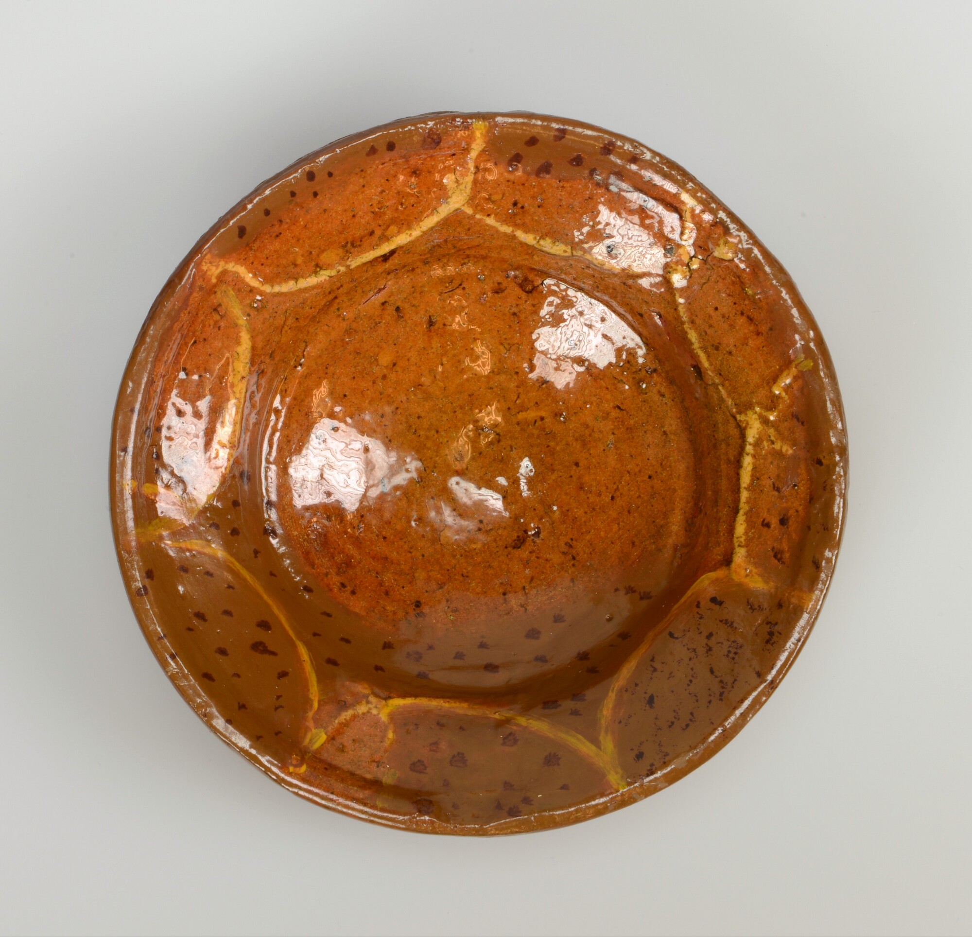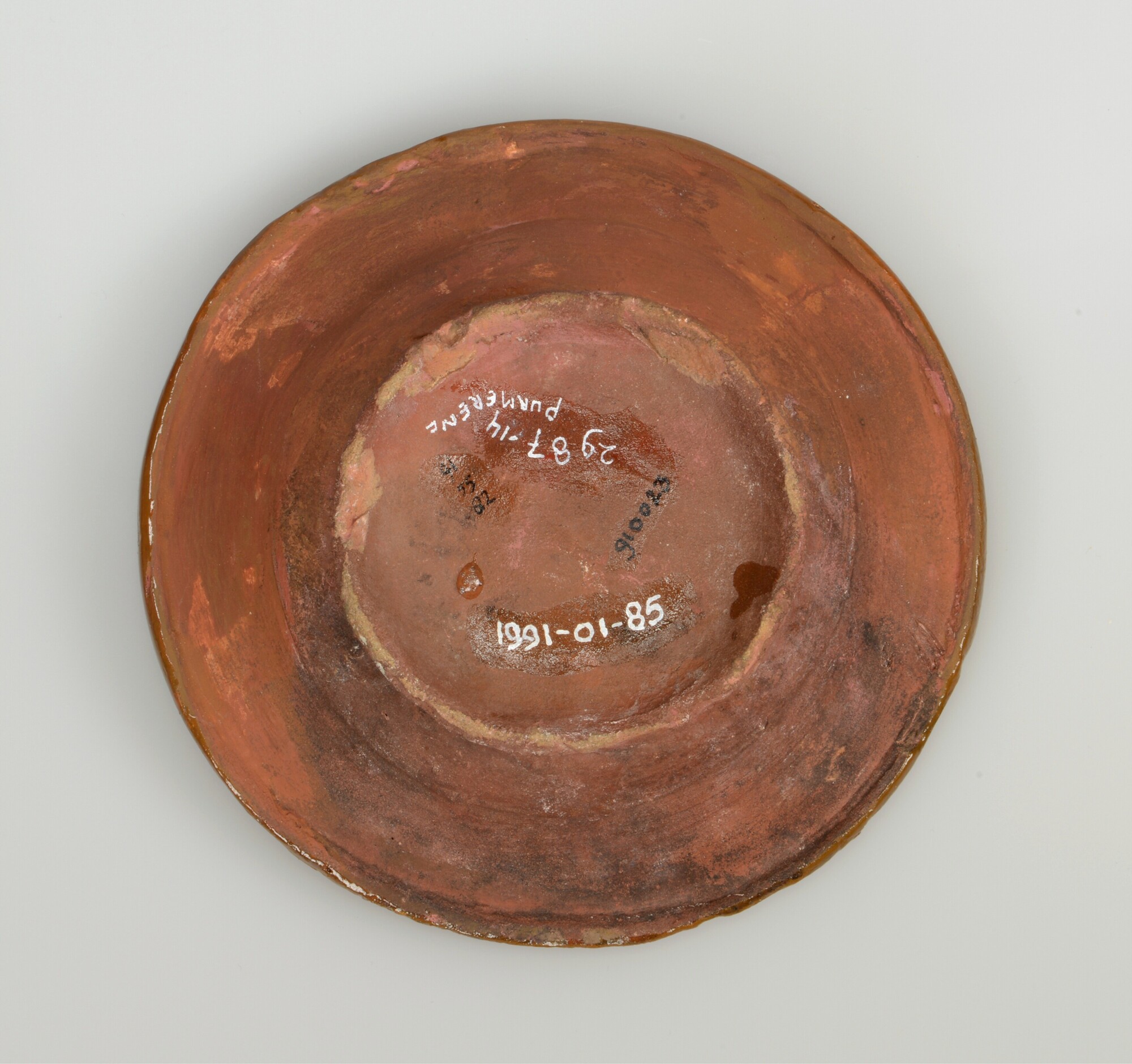 Bord; r-bor-21; bord met holle spiegel, knik spiegel-vlag, uitgebogen vlag met van buiten aangedrukte rand, smalle standring; roodbakkend aardewerk; inwendig loodglazuur; vl. ringeloorversiering: boogjes