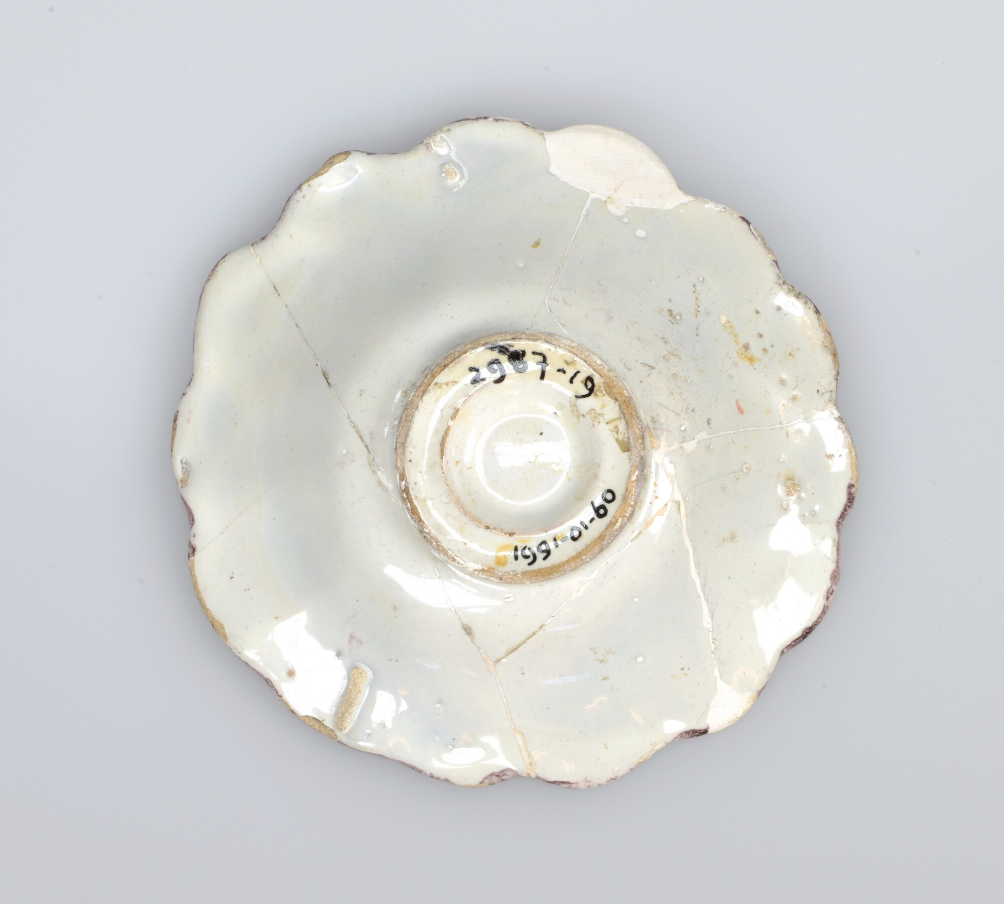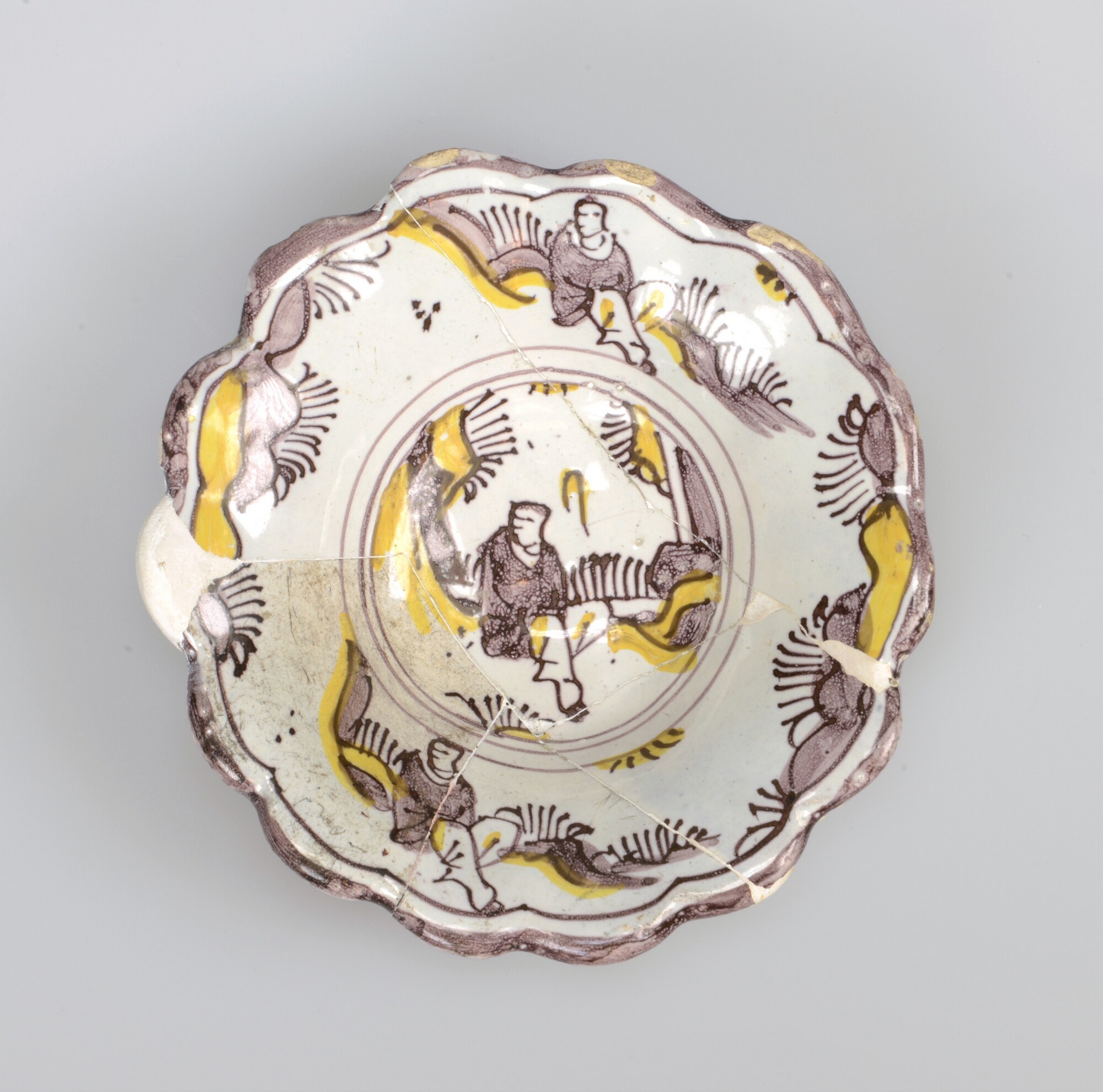 Plooischotel; f-plo-2; plooischotel met knik van spiegel naar vlag en alleen plooien in vlag; faience; tinglazuur; paars/geel, sp: binnen dubbele concentrische cirkel een Chinees in landschap; sp: twee Chinezen in landschap; standring; herkomst: West-Nederland