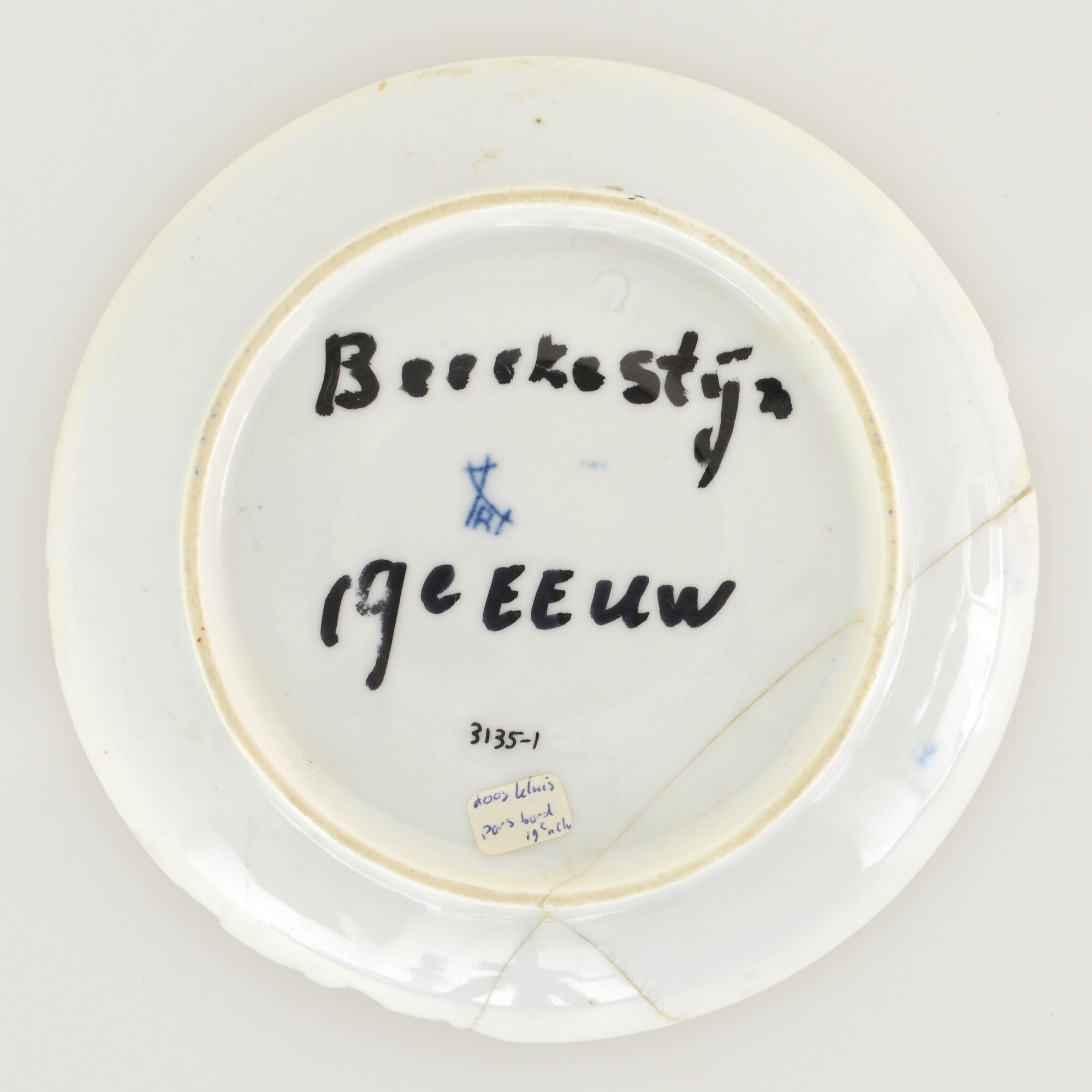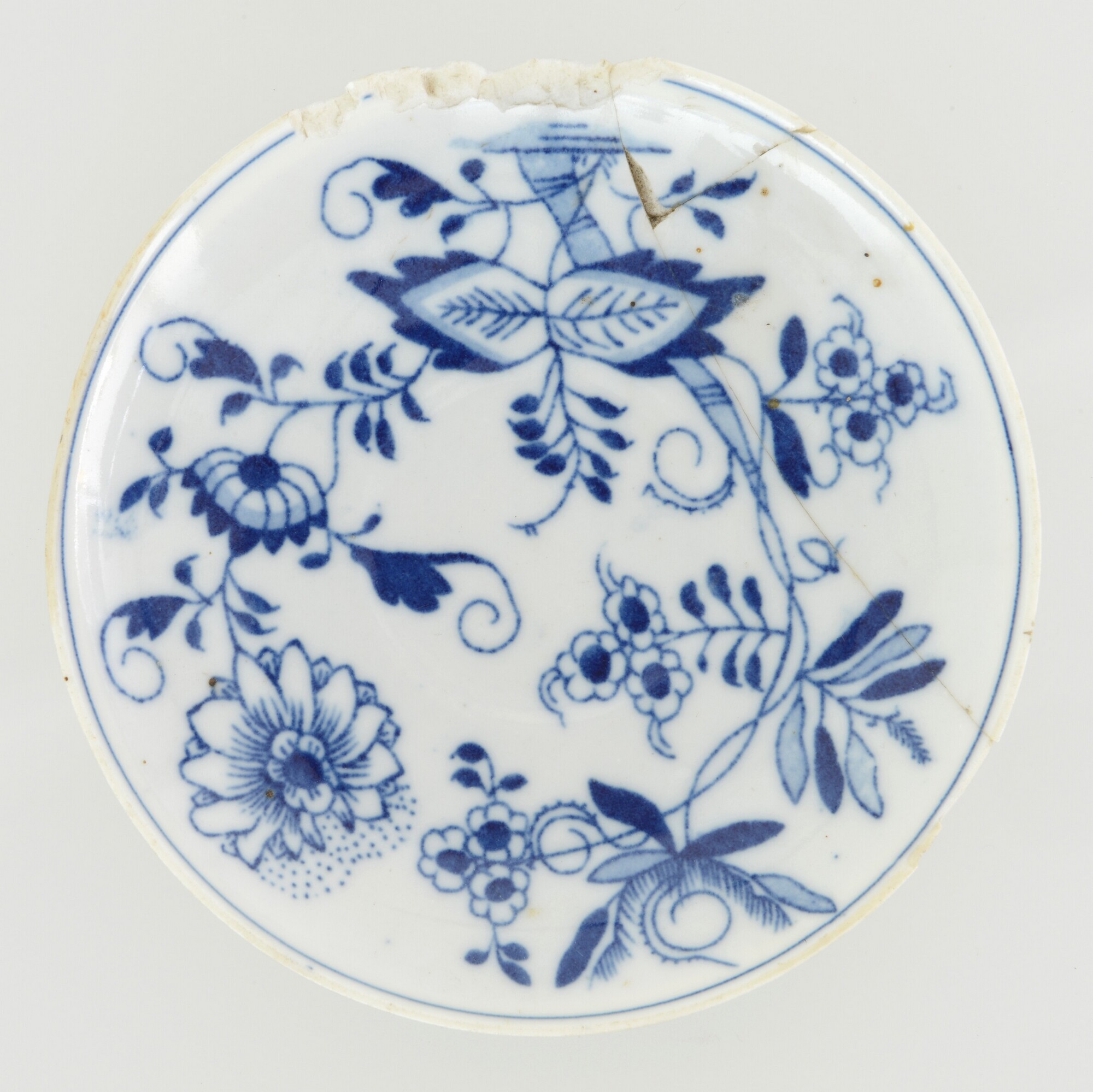 Schotel; ep-bor-1; afgerond bord met rechte rand, standring; Europees porselein; veldspaatglazuur; inwendig: onderglazuur blauw drukdecor: bloemen (Zwiebelmuster); beeldmerk; herkomst: Maastricht, MOSA