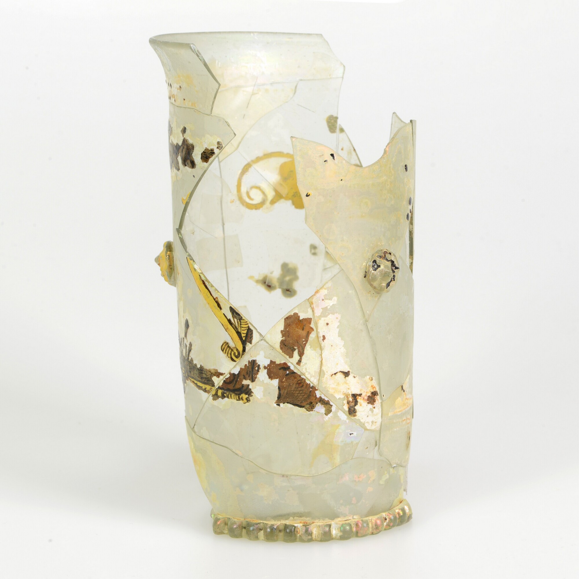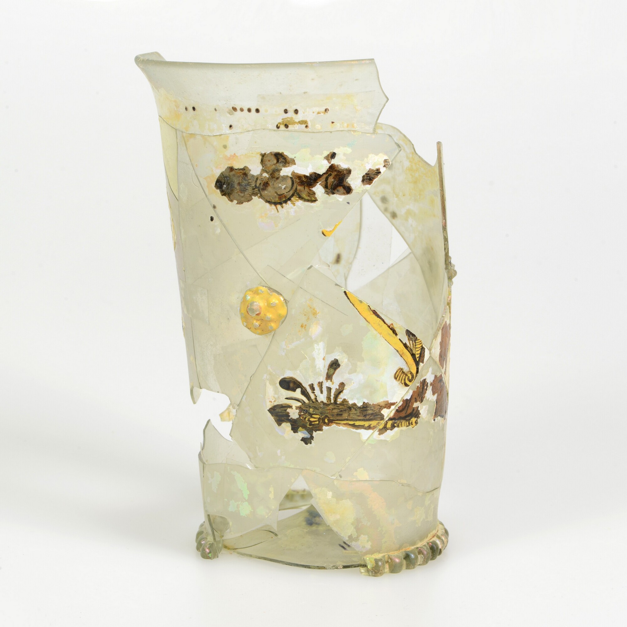 Beker; gl-bek-8a; kleurloos glas met email beschildering met floraal motief; braamnoppen; geribde voetring; herkomst: Bohemen of Duitsland