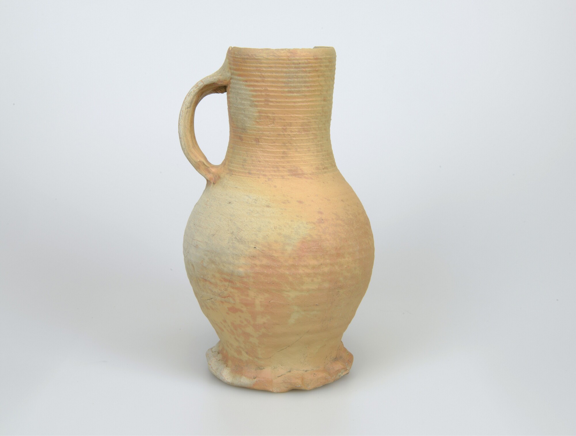 Kan; s1-kan-9; bolle drinkkan met hoge schouder en cilindrische hals, met ribbel op halsaanzet; steengoed; standring geknepen; één verticaal lintoor; herkomst: Siegburg