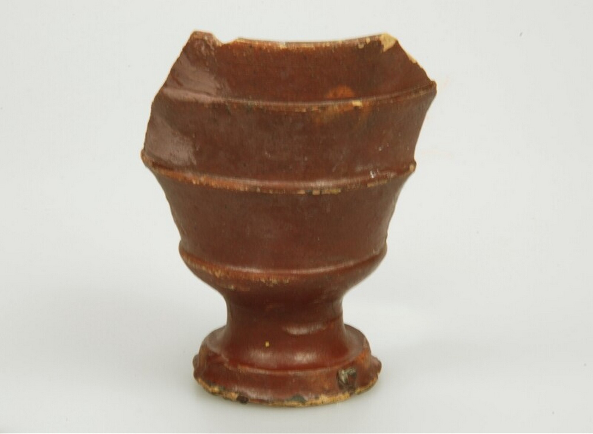 Beker; s5-bek-12; eierdopvormige beker met geprononceerde horizontale ribbels, standvoet; proto-steengoed; ijzerengobe; herkomst: Rijnland