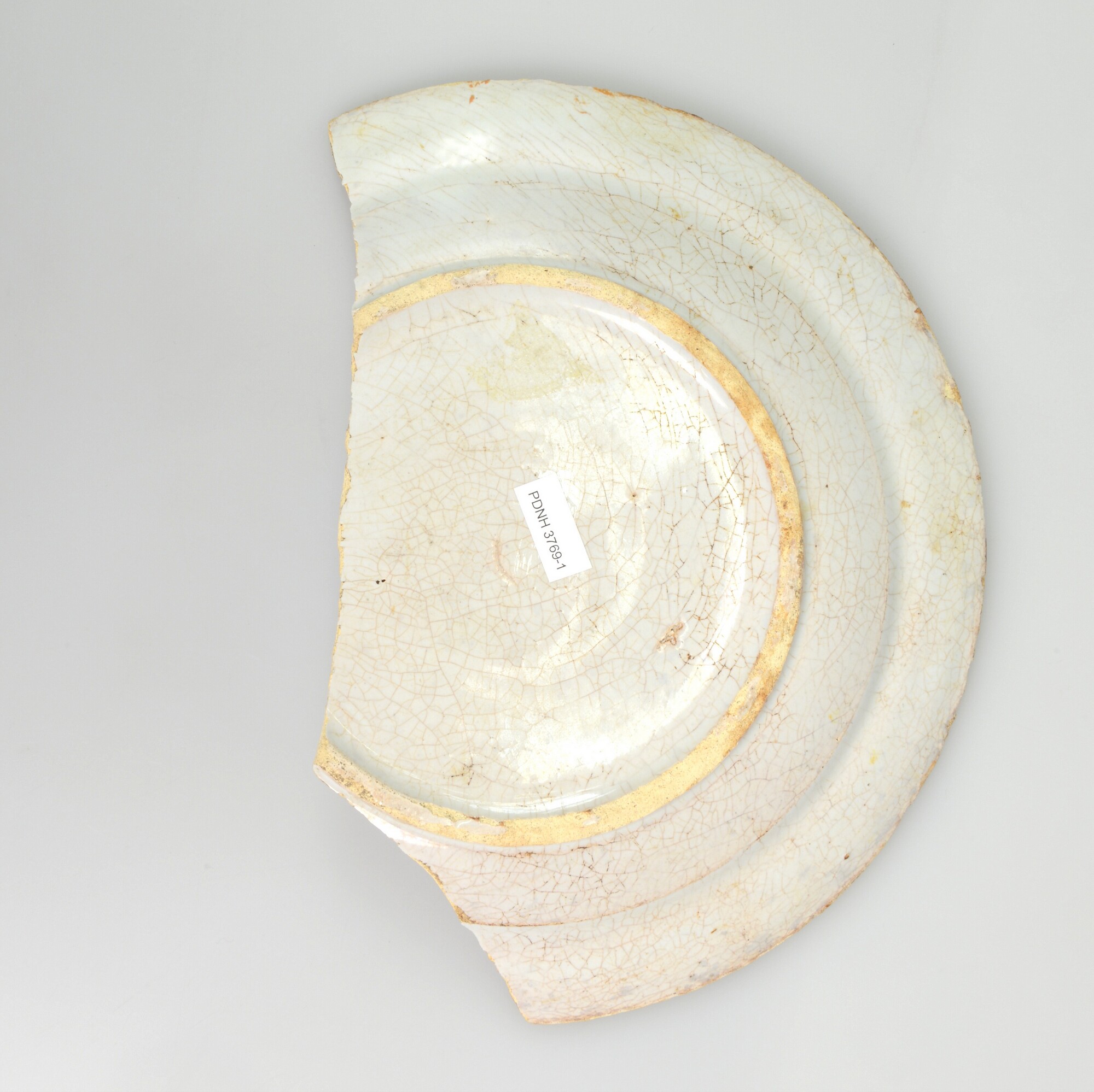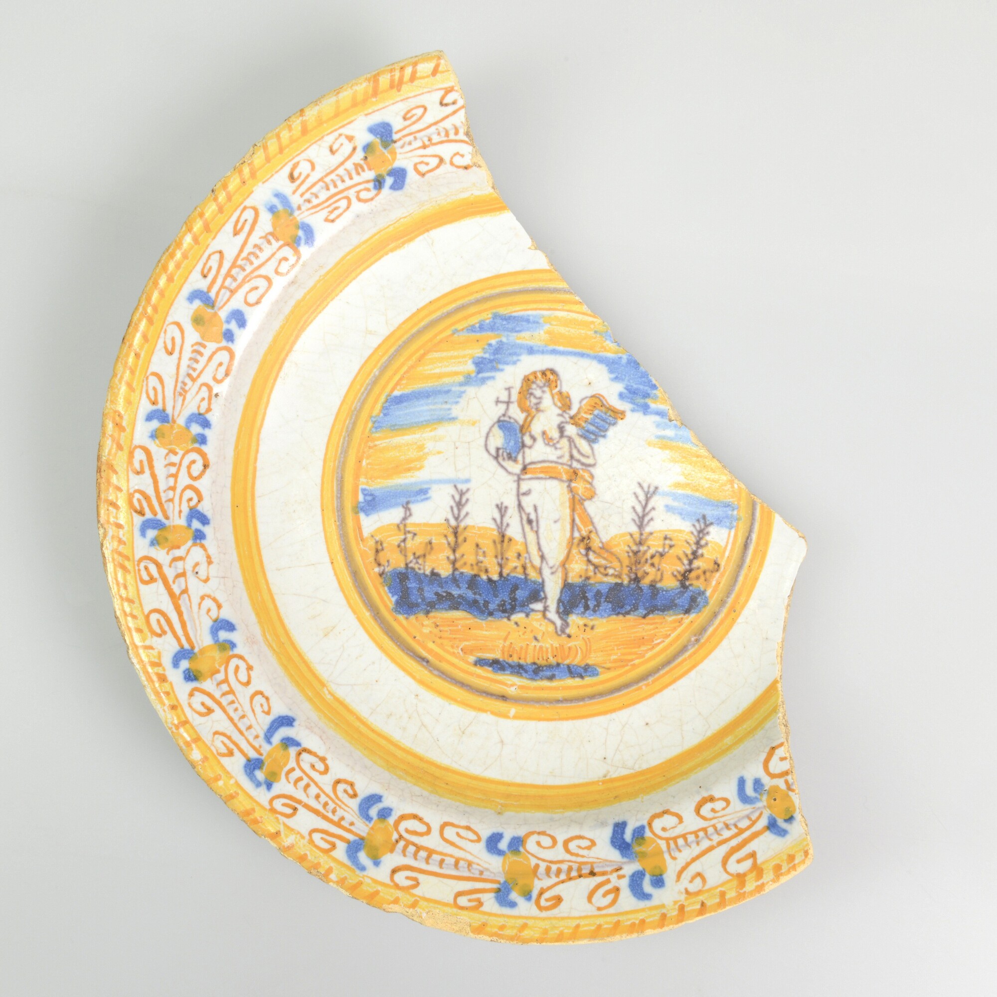 Bord; f-bor-7; diep bord met holle spiegel, knik spiegel-vlag, smalle vlag; Nederlandse faience; in- en uitwendig tinglazuur; gele/blauwe/bruine beschildering; sp: gevleugelde putto in landschap met rijksappel in de rechterhand en een sjerp om zijn middel en staat met zijn linker standbeen voor zijn rechter standbeen; vl: aigretterand; herkomst: Haarlem, werkplaats Willem Verstraeten?