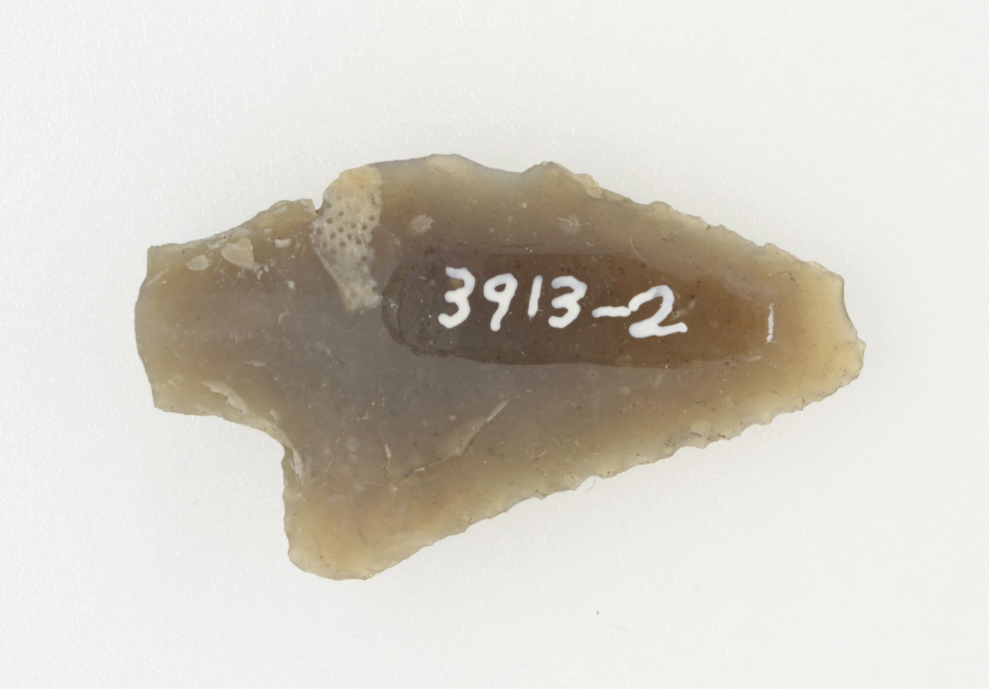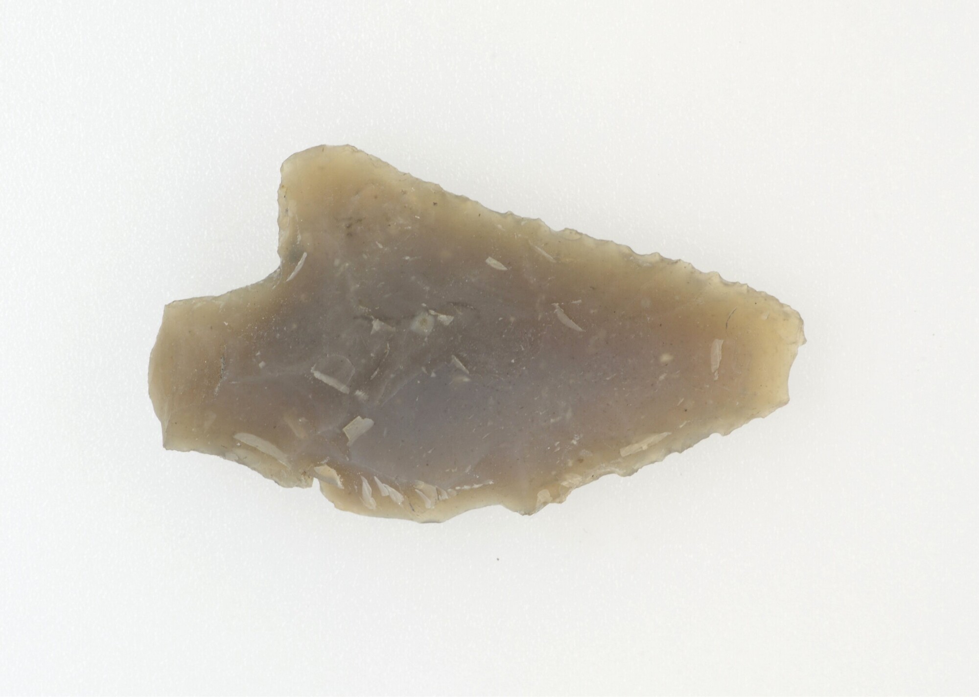 Pijlpunt; denneboomvorm met schachtdoorn en weerhaak; vondstgegevens: vak C24, datum: 5-9-1975, laag: XIII