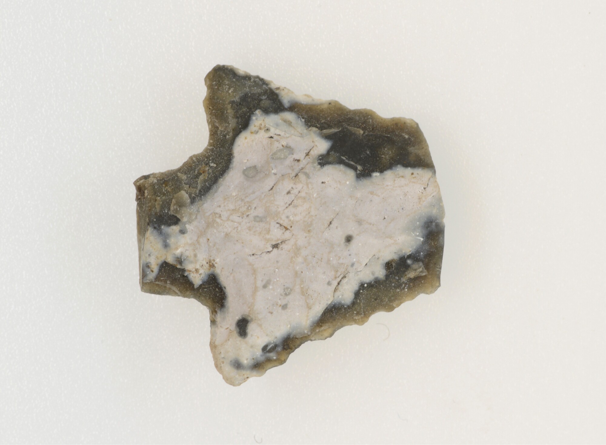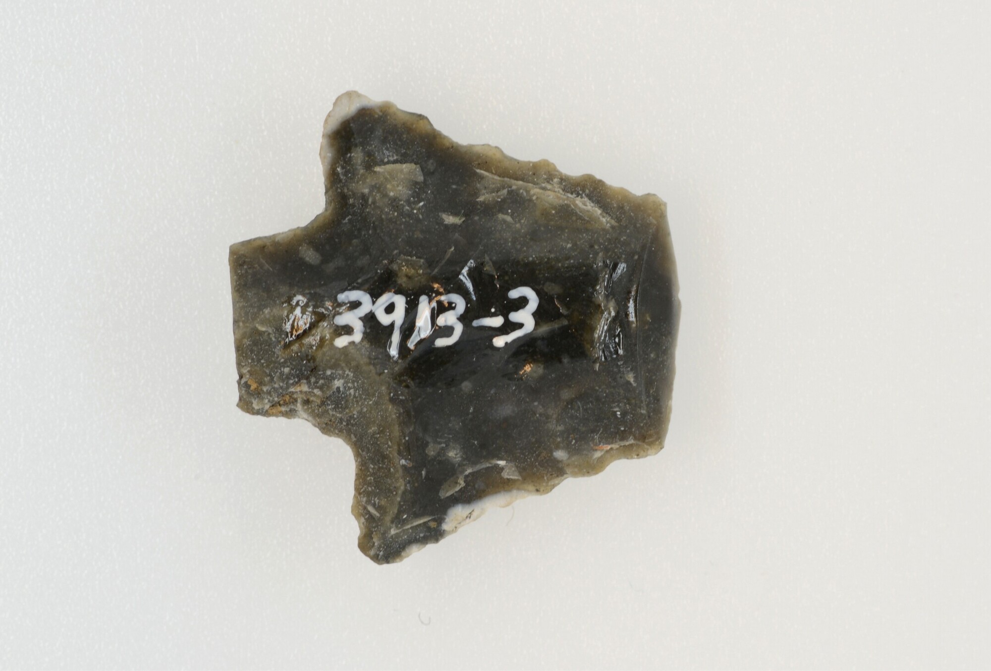Pijlpunt; denneboomvorm met schachtdoorn en weerhaken. aan één zijde cortex; puntig uiteinde afgebroken; vak: b24, datum: 19-8-1977