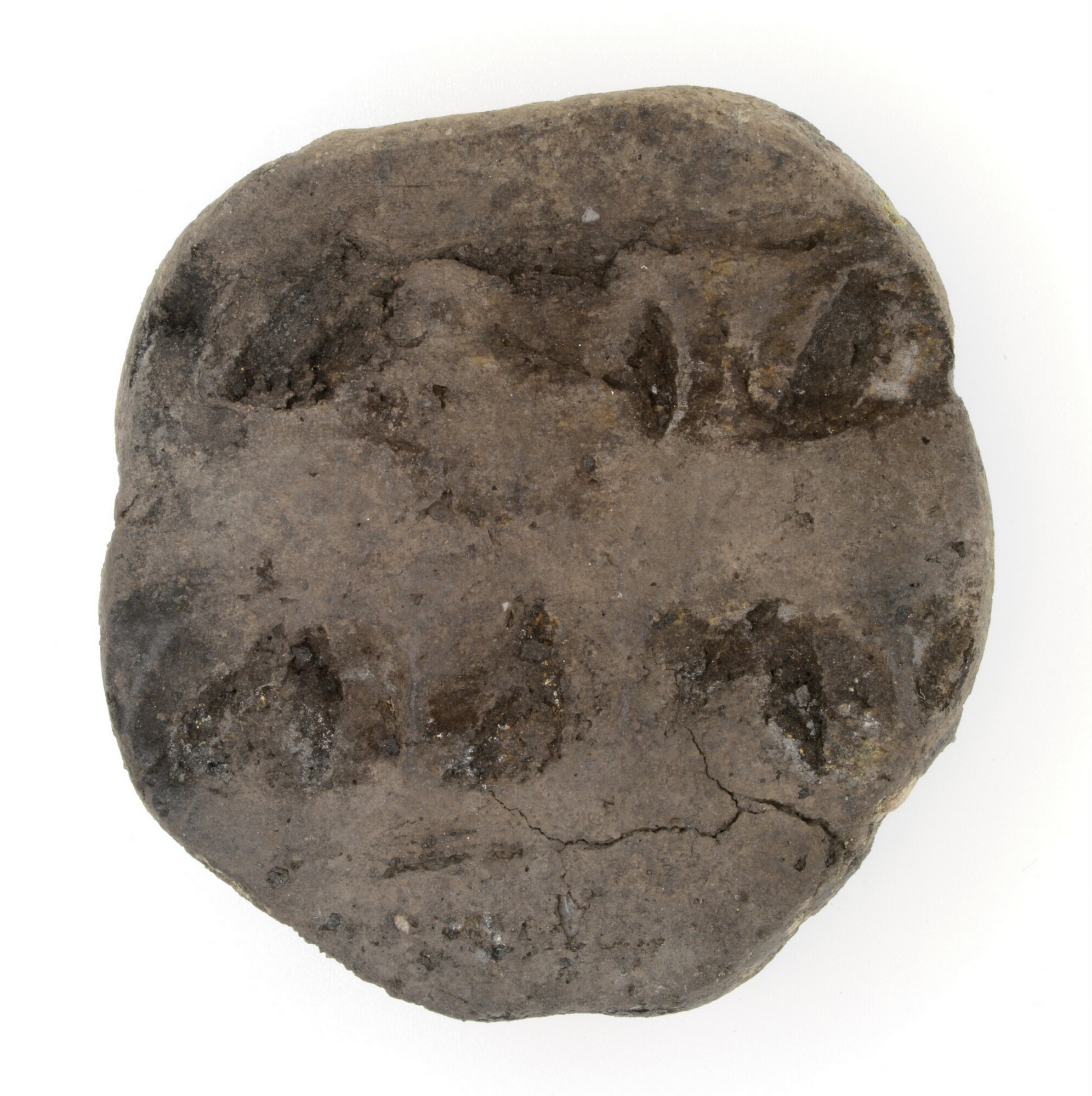 Speelschijf; ronde schijf vervaardigd uit een potbeker met twee rijen nagelversiering; vak: D24:26, laag II, datum: 30-7-1975