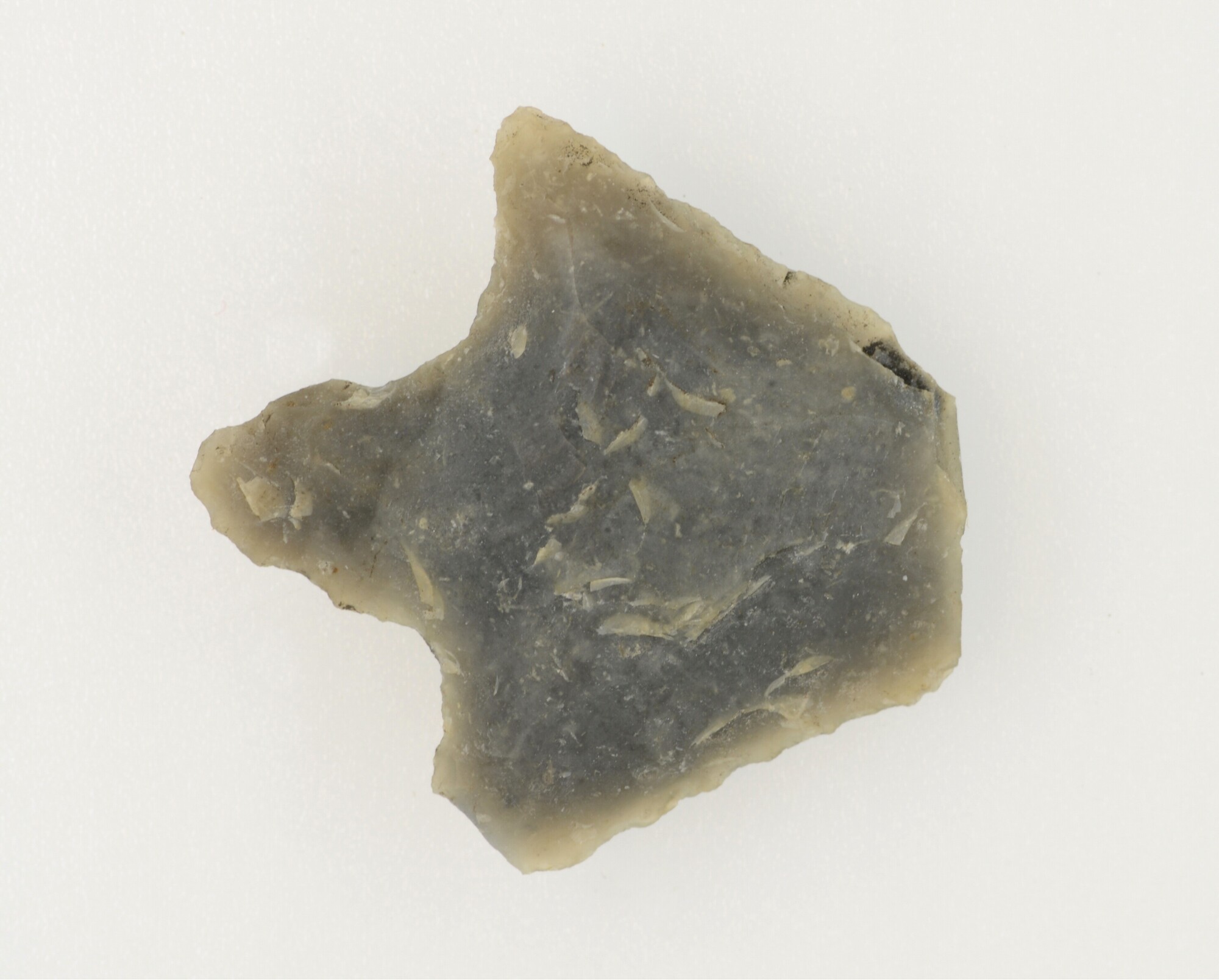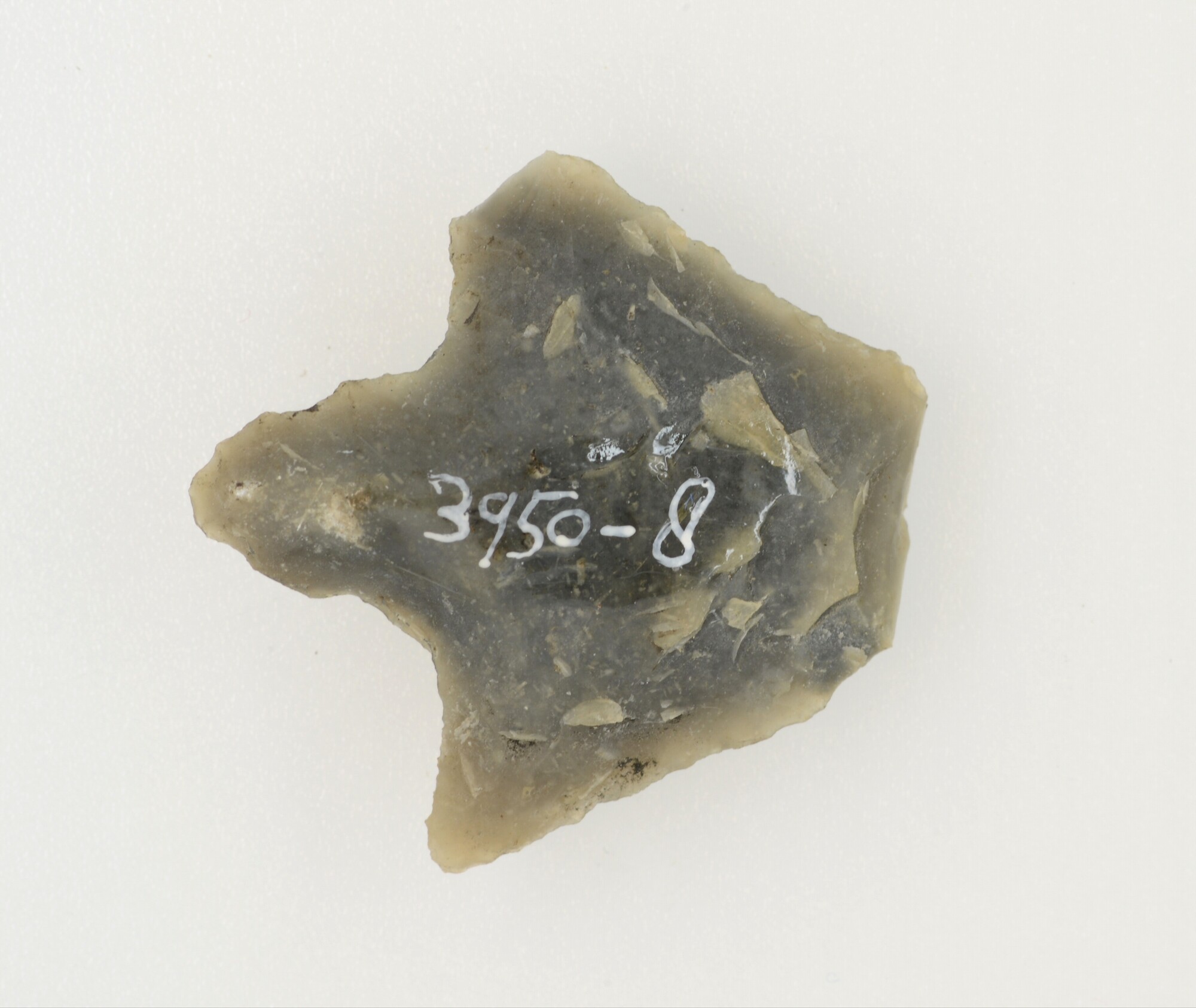 Pijlpunt; uiteinde spits afgebroken, één los bijbehorend fragment en vormt een onderdeel van één van de zijvleugels; vak: BI30:9, laag VI, vondstdatum: 24-9-1975