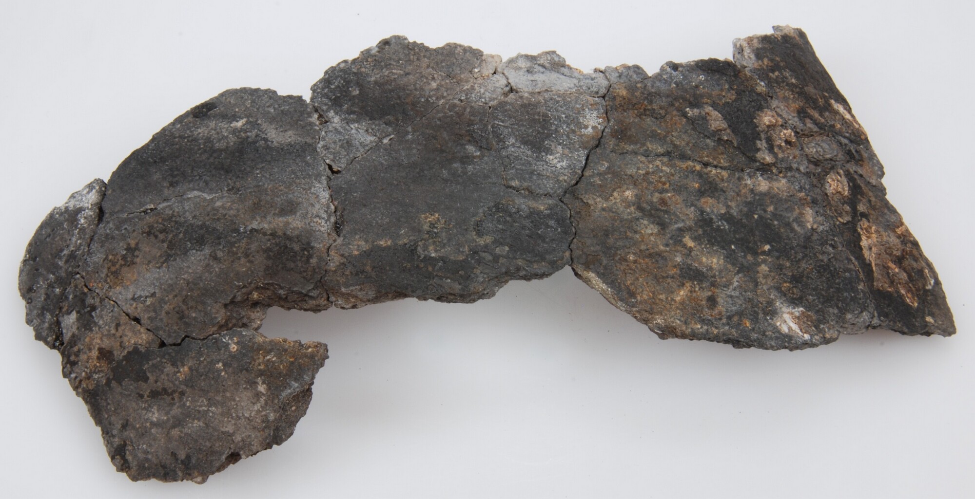 Potbeker; wandfragment met houtresten aan de buitenzijde; schelpmagering;