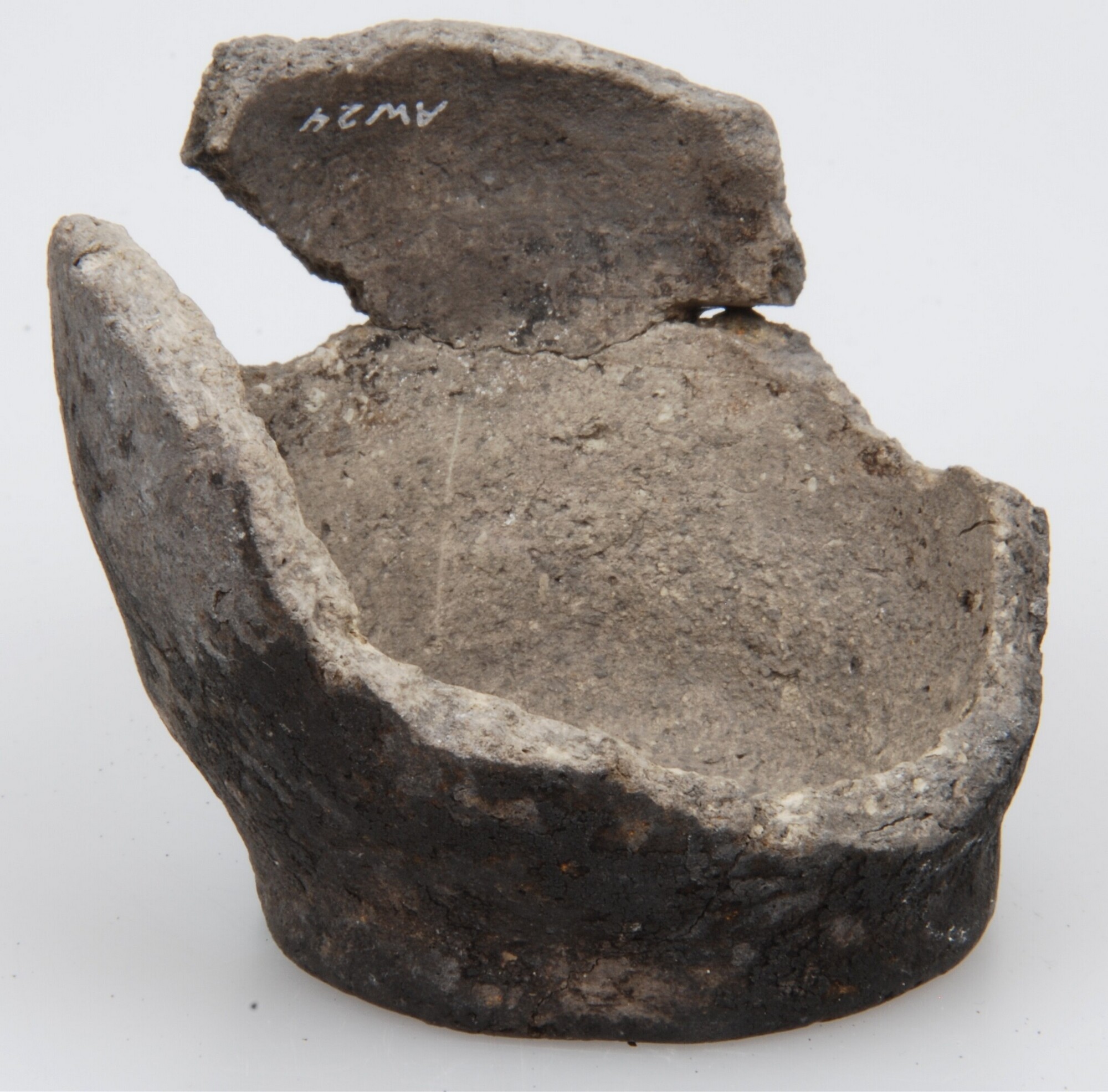 Potbeker; potgruis (?) magering; standvlak; verkoolde resten buitenzijde; vak: AW24