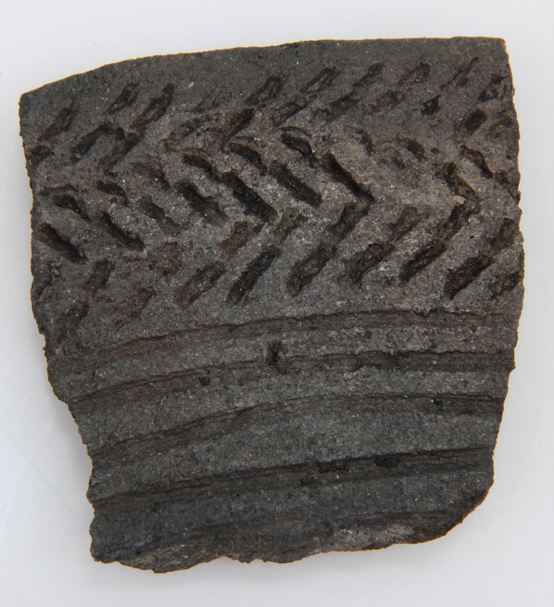 Standvoetbeker; randscherf met lijn- en zigzagversiering; verkoolde resten binnenzijde; vak: AW 260