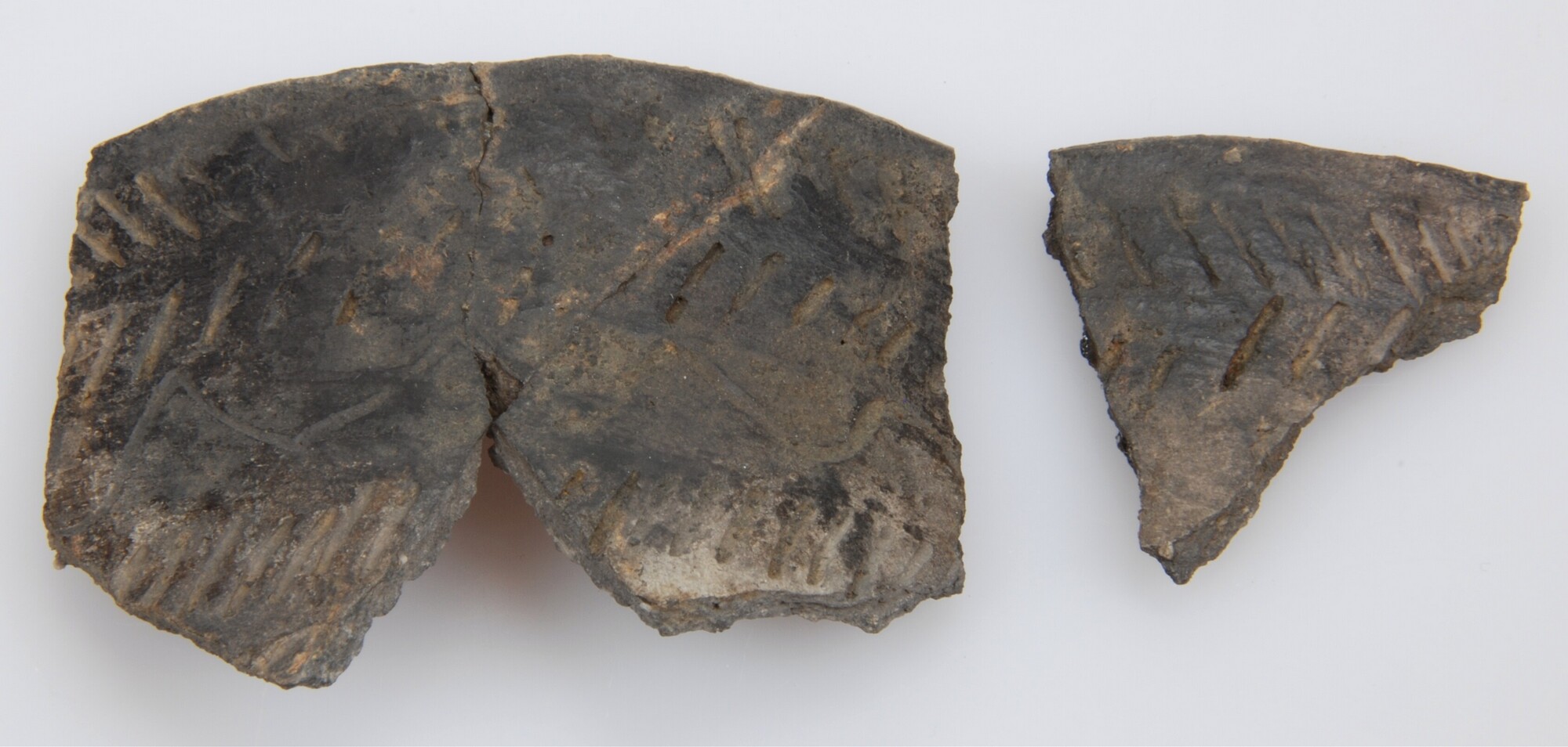 Standvoetbeker; twee randscherven met zigzag- en lijnversiering; steengruis magering; vak: AW 134