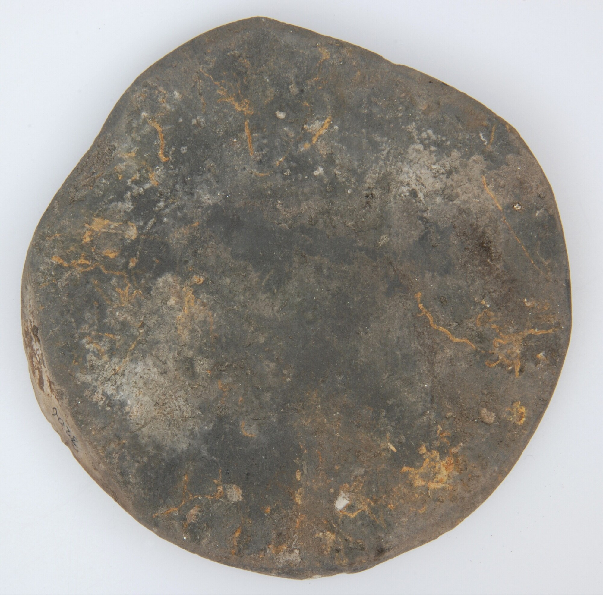 Schijf; inheems-romeins aardewerk; schijf met afgesleten rand; donkergrijs baksel